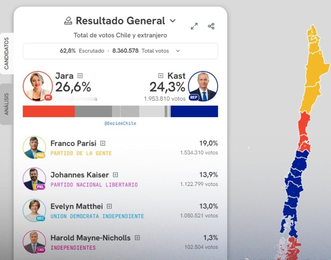 智利第一轮选举的计票已达62.8%。Jara得票26.6%。卡斯特24.3%。 但是,所有右翼候选人已经获得70.2% 的选票。刚才凯撒已经宣布,要求他的选民在第二轮投票时将所有选票投给卡斯特。 所以,12月14日的第二轮选举几乎没有悬念,大致算横扫吧。
