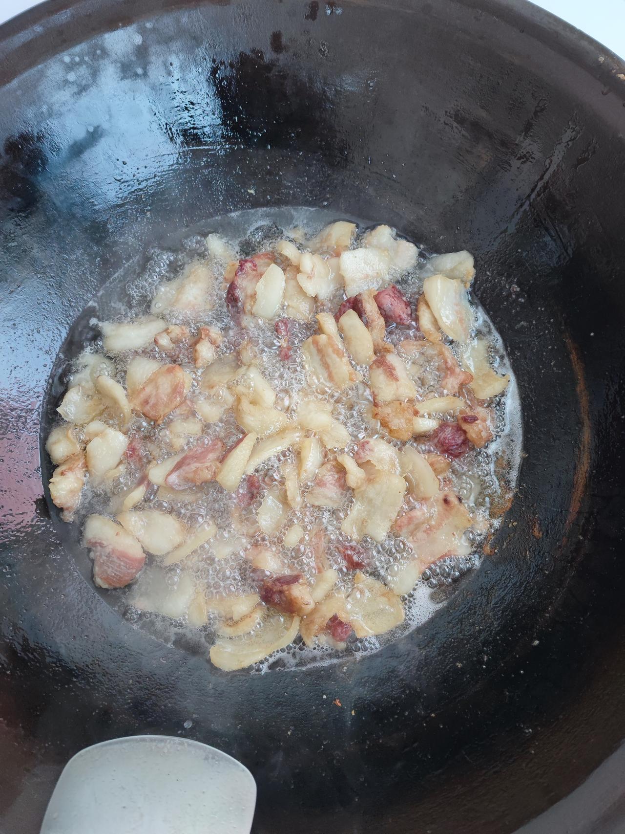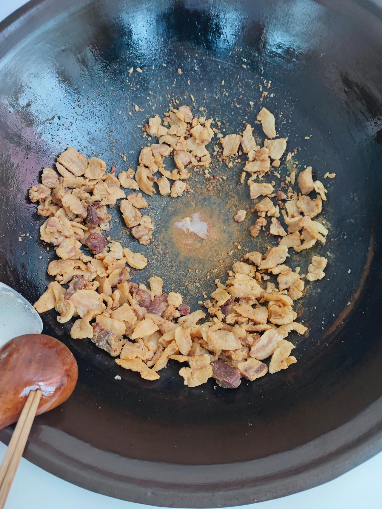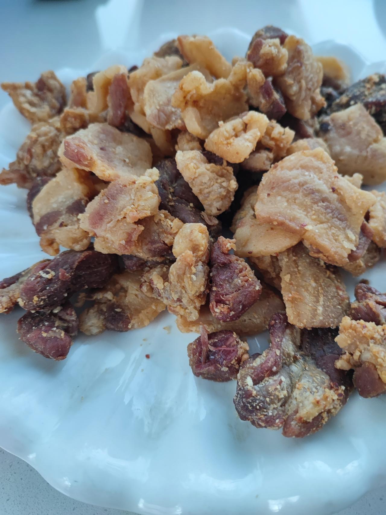 最近专家又说吃猪油对身体好! 最近几年都不吃猪油了, 听专家说的。 每次买肉肥的切出来攒一起送人, 前几天又听专家说吃猪油有好处, 把前几回的肥肉找出来熬油, 又放了几块瘦肉一起熬的, 肥肉熬好了, 瘦肉也炸熟了, 和牛肉干差不多, 馋了吃点, 猪油留着过几天炖酸菜粉吃, 友友们有没有吃猪油的, 专家说可以吃的![黑线]