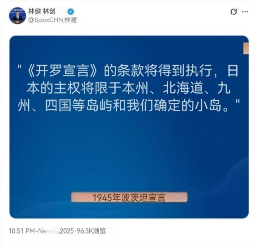 漂亮!终于到这里了!外交部发言人林剑写道:根据波茨坦公告,日本的国土仅限于本州、四国、九州、北海道四岛! 很显然,这是告诉小日子,这段历史你们不能忘,这个国家秩序你们要遵守。不仅小日子不要妄想介入台海,琉球的地位也应该重新考虑,而我们也要重申一下驻军权。 林剑的这番话,是在回应高市早苗等日本政客近期在涉台问题上的挑衅言论。其实这并不稀奇,日本政坛总有一些人时不时就跳出来蹭热度,台海问题一热,他们就跟着冒头。 但这次明显不同,外交部的回应不再是过去那种点到为止的“严正交涉”,而是直接回溯到波茨坦公告,掀开了历史的底牌,说白了就是:你们连自己国家的边界都还没搞清楚,还想着来插手中国的家务事? 波茨坦公告可不是随便说说,它是二战结束前美英中三国联合对日本发出的最后通牒,明确规定日本的主权范围只限于四个主要岛屿。 这不是中国单方面说的,而是国际法框架下的共识,是战后国际秩序的重要一环。问题就在于,战败之后的日本在美国的庇护下,逐渐模糊了这些基本界限。 不但在钓鱼岛问题上做文章,现在又跑来对台海问题指手画脚。这时候拿出波茨坦公告,就是要提醒所有人:当年签的字,现在别装不认识。 更有意思的是,林剑这次话里还带出了“琉球”这个词。这就不是简单的历史回溯了,而是对日本当前在亚太地区角色的一种现实提醒。 琉球问题虽说多年没被提及,但它从来没被遗忘。美国至今在冲绳维持大量驻军,日本却一直拿琉球当自己领土来主张主权,而实际上琉球民族与日本民族根本不是一回事。 如果说台海是中国国家统一的核心问题,那琉球就是战后秩序是否还被当回事的试金石。中国现在重提驻军权,其实就是把历史和现实重新捆绑起来。 告诉世界,战后秩序不是日本可以随意选择性遵守的菜单。这也难怪最近各路官媒都罕见地密集发声,不仅是对高市早苗的点名批评,更是对日本整体对华政策的敲打。 过去几年,日本在美国推动下频频参与所谓的“印太战略”,对中国搞围堵、搞小圈子,台海、南海、日本都想插一脚。但中国的态度已经非常明确。 历史问题不回避,现实问题必须掂量清楚。尤其是在中日关系本就不算稳定的当前节骨眼上,日本如果继续在敏感议题上挑衅,别怪中国把新账旧账一块算。 更值得注意的是,这番表态不仅仅是对日本的回应,也是在全球局势动荡之际,向其他国家传递一种信号:中国不会在主权问题上让步。 看看最近中东战火不断,欧洲也不太平,美国忙着选举内斗,全球格局正在重塑。而亚太地区正是未来最可能发生战略博弈的前沿阵地。 在这个节点,中国拿波茨坦公告来谈日本,就是在用法律和历史的双重基础,提前划定边界,摆明态度。 从这点看,“漂亮”两个字真不是网友随便喊的。这种精准点题、言之有据又气势十足的回应,既有历史深度,也有现实分量,真正做到了“有理有利有节”。 外交部不再只是做传统意义上的回应,而是通过一场场硬核发言,逐步构建起属于中国的话语体系和外交风格。现在的发言人,不光是传声筒,更是前线的“定音锤”。 如果说过去中国在国际舆论场上常常被动应对,现在则是主动出击、主动设题、主动引导叙事。这次用波茨坦公告来打日本,不仅打得有据,还打得有深意。 让人不得不佩服这波操作的精准和层次感。未来无论日本还想在台海问题上搞什么小动作,只要波茨坦公告还在,只要国际秩序这本账还没翻篇,中国就不缺底气,不缺工具,更不缺话语权。 所以说,这一波确实漂亮,不仅漂亮在语言上,更漂亮在布局和战略上。小日子如果还想装糊涂,那就得准备好面对更多历史的回响和现实的对账。 这不是威胁,而是一种再清楚不过的提醒:不遵守规则的游戏,谁也玩不下去。