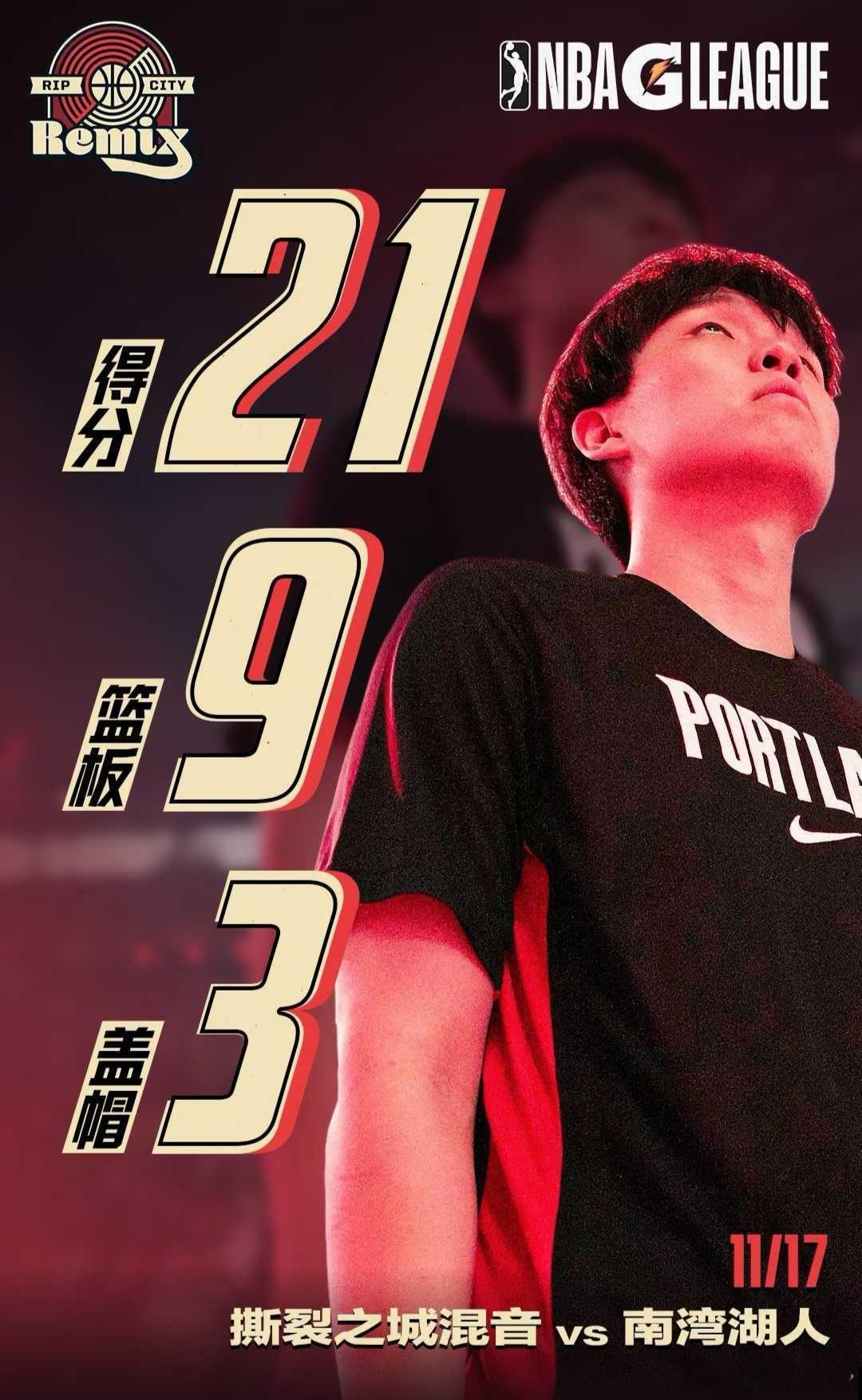 虽然撕裂之城混音队111-113惜败南湾湖人,但杨瀚森在NBA发展联盟第二战就已