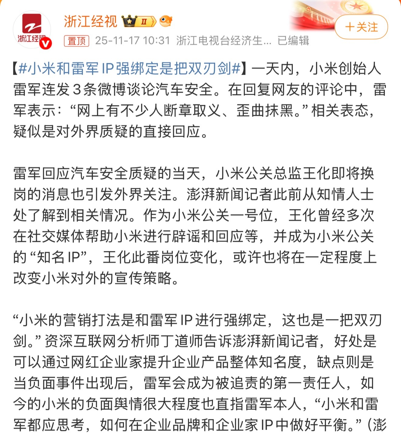 这是人尽皆知的事吧,打造创始人IP有助于节省营销费用,这方面最杰出的代表就是马斯克。早年特斯拉没有任何广告预算,就靠顶级产品和创始人来推广,但是这对产品力和创始人的要求都很高,而且创始人要做到不惧流言蜚语,马斯克就是这样干的,你骂我就骂我呗,我也不在意。但是雷军和小米做不到,一个是产品上没有特斯拉的优势,特斯拉依旧是新能源汽车的领头羊(综合产品和品牌),另一个是雷军和小米做不到马斯克那样完全屏蔽外界负面评论(会影响商业利益)。当然,核心还是产品不够强,如果小米的产品像苹果一样强,也能不惧批评。总的来说,本博觉得雷军和小米学马斯克和特斯拉学了一半,这次公关调整也很有必要。