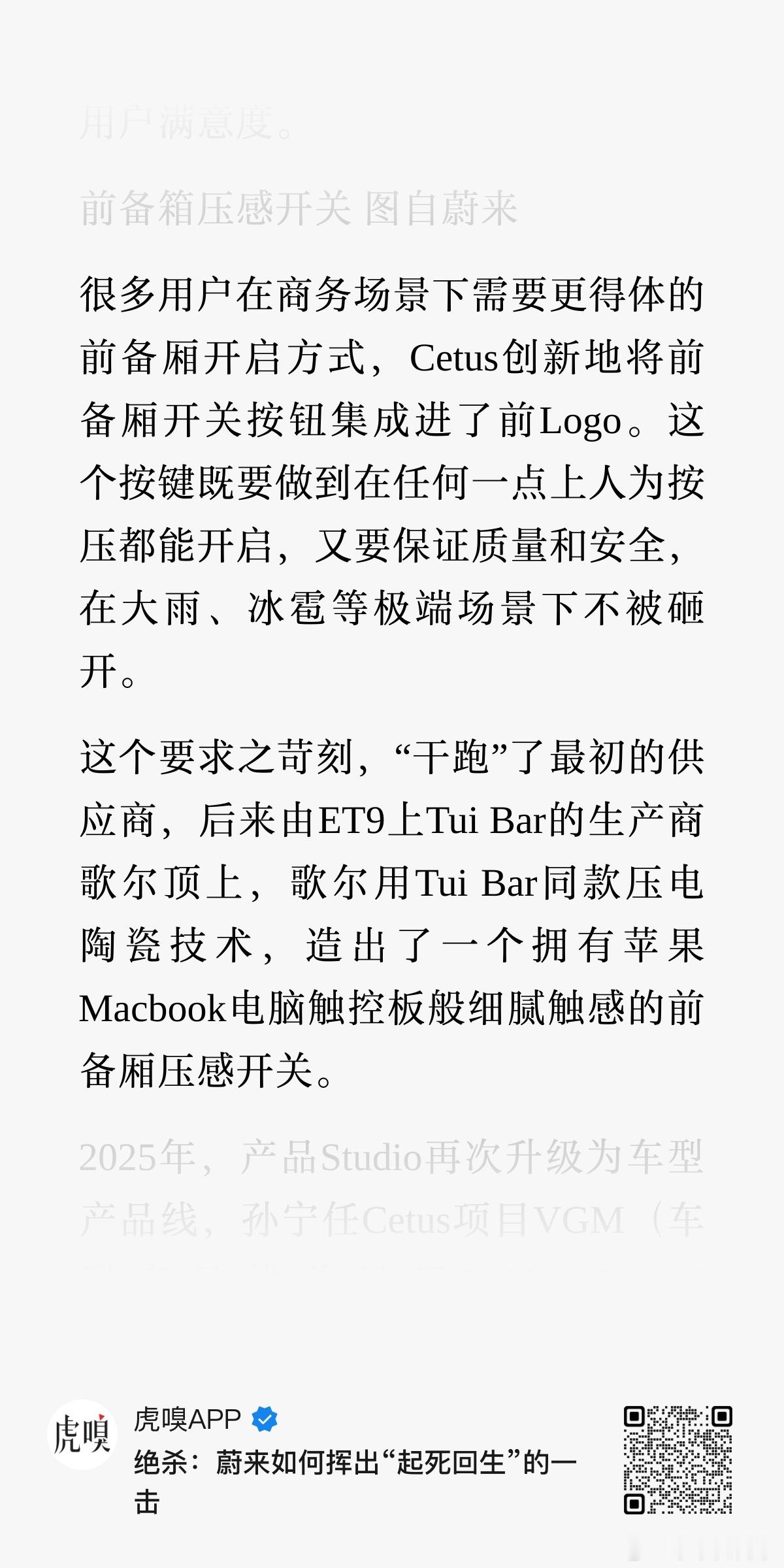 关于这个前备舱开启方式,之前我和产品经理聊过,前备舱作为“新物种”,开启方式和稳定性其实颇受考验。前备舱既要能够按压logo平稳打开,同时又不受天气和雨点等影响,还要能够在不同部位“防夹”,其实当时找了很多供应商。我当时问过他们产品经理目前这个体验是行业最好吗?他们很肯定的说是最好,结果还有一些品牌的KOC不服气,来挂我。那些品牌要么没有前备舱,要么前备舱小的可怜,要么只有手动开合而且还要花大力气的,就别在蔚来这个230L的自动开合防夹前备舱面前班门弄斧了吧?什么是技术,这就是技术!
