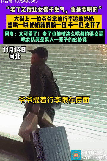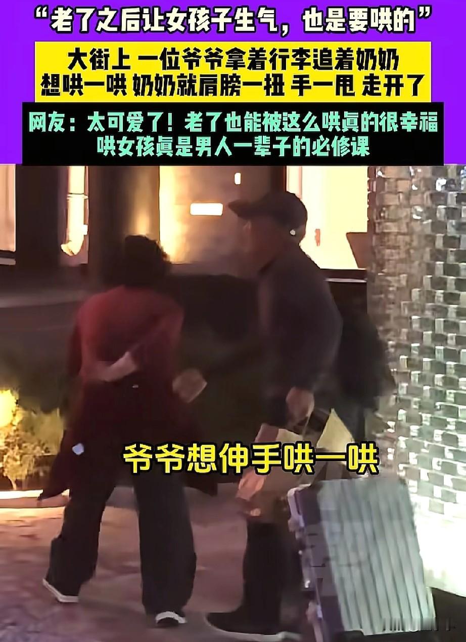 太可爱了!大街上一对老夫老妻闹别扭,爷爷拉着箱子追着奶奶,想要哄一哄,奶奶可不买账,胳膊一甩走开了,理都不带理爷爷。 爷爷又再次想要去牵着奶奶的手,本以为能成功的,却还是扑了一个空。 这可爱的一幕正好被行人给拍了下来,直接发布在了平台上,引起了很多网友的热议。 有网友表示,有些人到老都愿意哄你,有些人明明自己有错在先,却觉得你在外人面前落他面子。 有的网友也觉得,这男人真可怜,从年轻一直卑微可怜到老,看似是哄了这一会,其实是哄了一辈子。 其实这也从侧面说明了,老爷爷很爱奶奶的,要不然管你多生气,看都不看一眼,而不是像这样,拉着行李还要哄你。