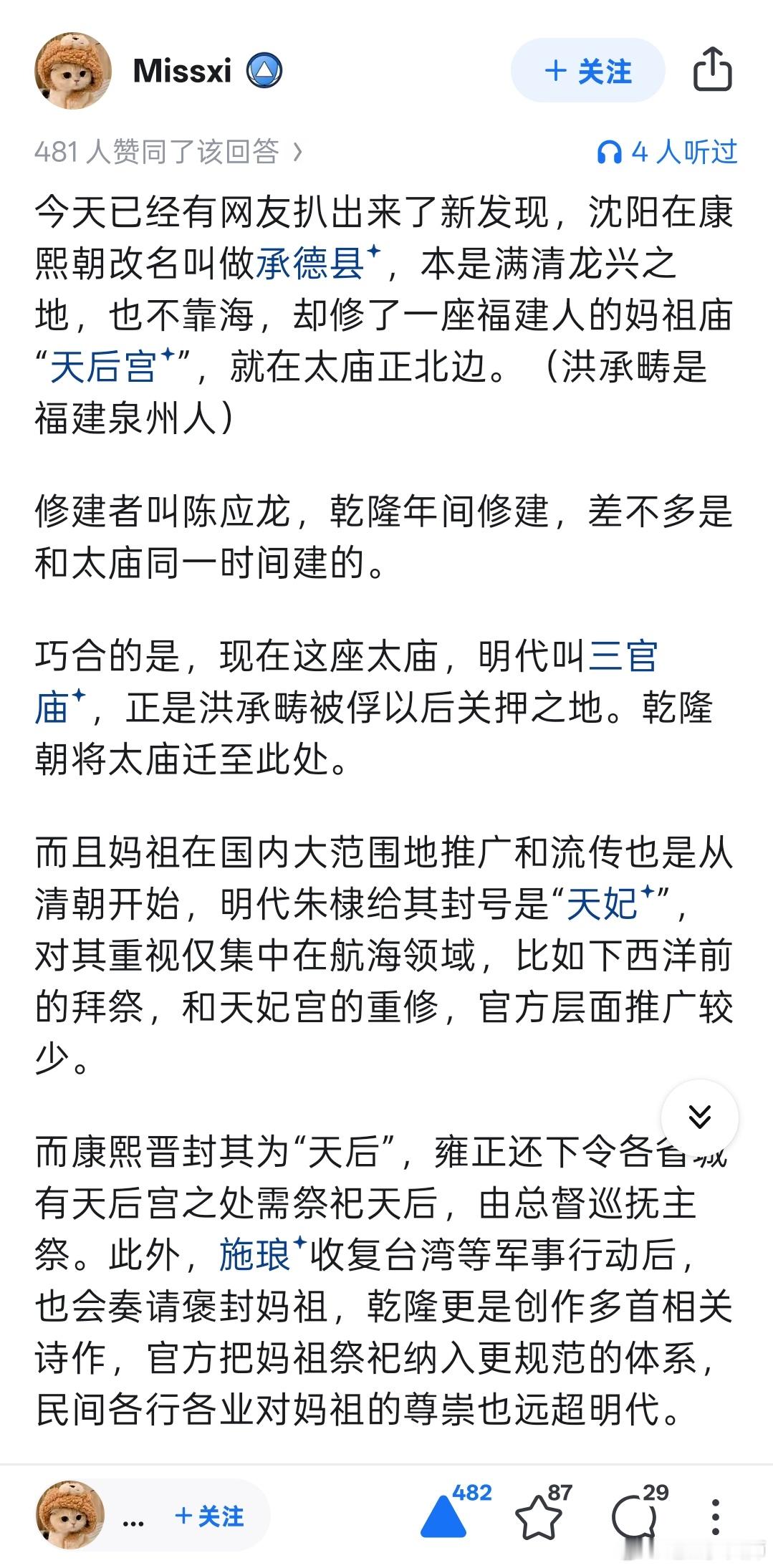 新发现:沈阳本是满清龙兴之地,也不靠海,却修了一座福建人的妈祖庙“天后宫”,就在太庙正北边。(洪承畴是福建泉州人)。修建者叫陈应龙,乾隆年间修建,差不多是和太庙同一时间建的。沈阳清朝太庙的事情我之前说过,原本叫三官庙,洪承畴被俘后,据说就在这个地方被大玉儿劝降,这个东西沈阳故宫博物院的自己网页上就有介绍。妈祖在国内大范围地推广和流传也是从清朝开始,明代朱棣给其封号是“天妃”,对其重视仅集中在航海领域。而康熙晋封其为“天后”,雍正还下令各省城有天后宫之处需祭祀天后,由总督巡抚主祭。此外,施琅收复台湾等军事行动后,也会奏请褒封妈祖,乾隆更是创作多首相关诗作。啊?