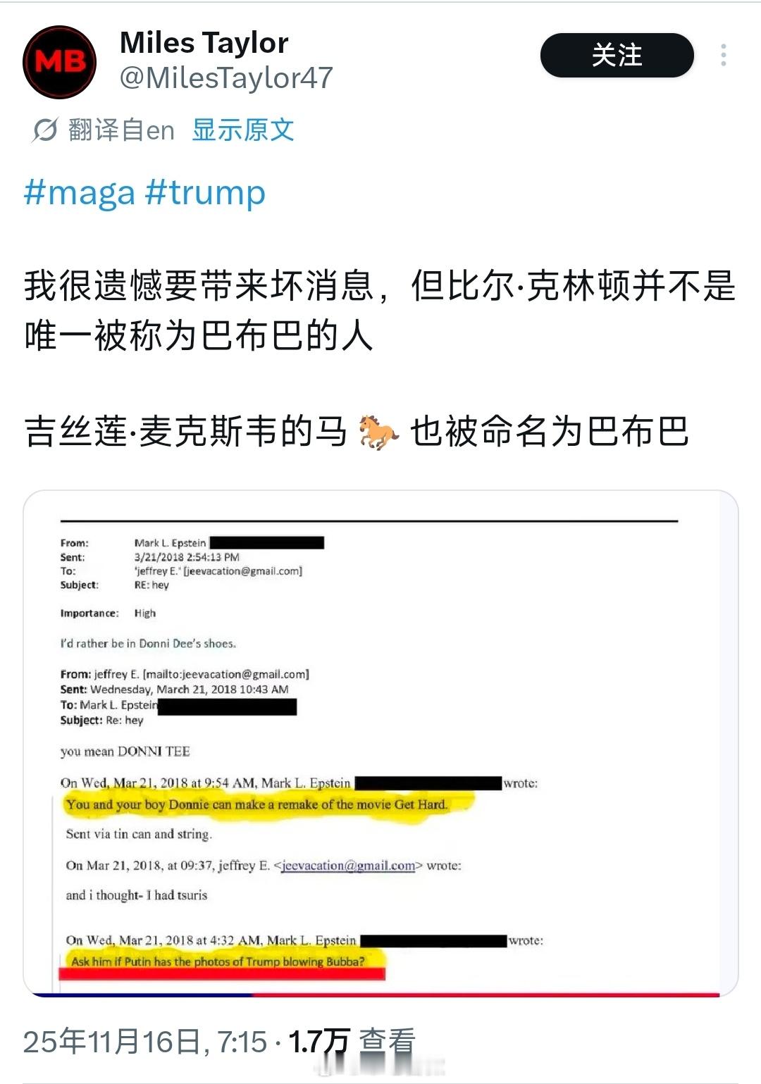 杰弗里·爱泼斯坦的兄弟马克·爱泼斯坦说,“布巴”不是比尔·克林顿。但收邮件的麦克斯韦尔家里有一匹马,叫“布巴”。