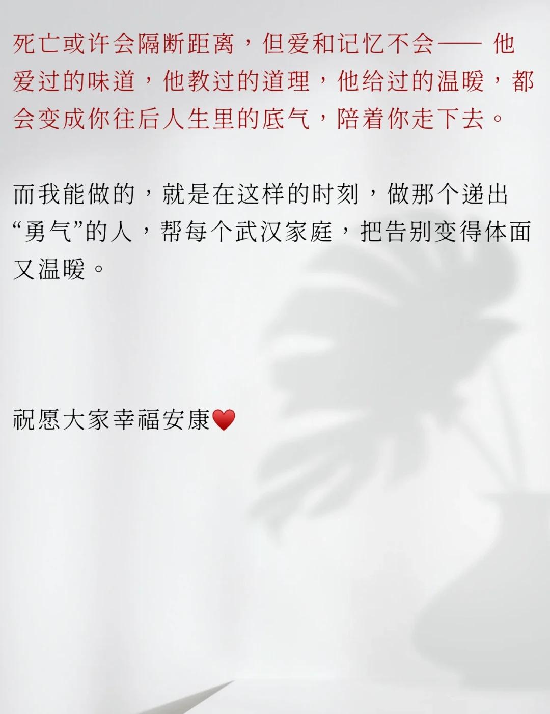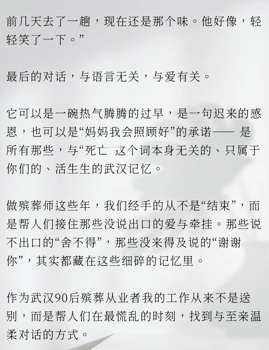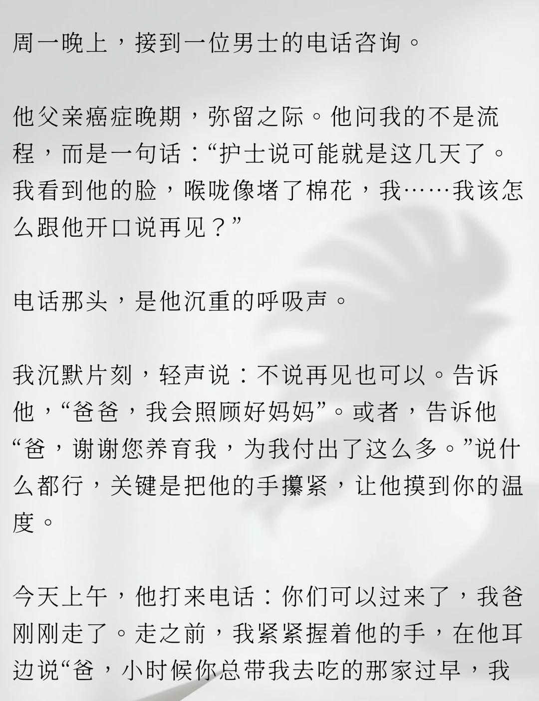 武汉殡葬师故事|父亲癌症晚期,他问我…… 周一晚上,接到一位男士的电话咨询。 他父亲癌症晚期,弥留之际。他问我的不是流程,而是一句话:“护士说可能就是这几天了。我看到他的脸,喉咙像堵了棉花,我……我该怎么跟他开口说再见?” 电话那头,是他沉重的呼吸声。 我沉默片刻,轻声说:不说再见也可以。告诉他,“爸爸,我会照顾好妈妈”。或者,告诉他“爸,谢谢您养育我,为我付出了这么多。”说什么都行,关键是把他的手攥紧,让他摸到你的温度。 今天上午,他打来电话:你们可以过来了,我爸刚刚走了。走之前,我紧紧握着他的手,在他耳边说“爸,小时候你总带我去吃的那家过早,我前几天去了一趟,现在还是那个味。他好像,轻轻笑了一下。” 最后的对话,与语言无关,与爱有关。 它可以是一碗热气腾腾的过早,是一句迟来的感恩,也可以是“妈妈我会照顾好”的承诺—— 是所有那些,与“死亡”这个词本身无关的、只属于你们的、活生生的武汉记忆。 做殡葬师这些年,我们经手的从不是“结束”,而是帮人们接住那些没说出口的爱与牵挂。那些说不出口的“舍不得”,那些没来得及说的“谢谢你”,其实都藏在这些细碎的记忆里。 作为武汉90后殡葬从业者我的工作从来不是送别,而是帮人们在最慌乱的时刻,找到与至亲温柔对话的方式。 死亡或许会隔断距离,但爱和记忆不会—— 他爱过的味道,他教过的道理,他给过的温暖,都会变成你往后人生里的底气,陪着你走下去。 题外话:还记得小时候我爸爸每天跟我带不一样的过早,豆皮,热干面,牛肉粉…那时候的过早真的是好吃呀,现在武汉的过早都差点意思了感觉。 殡葬师是种星星的人 武汉殡葬 武汉白事 武汉过早 告别愿人间再无疾病 温暖治愈 癌症 故事