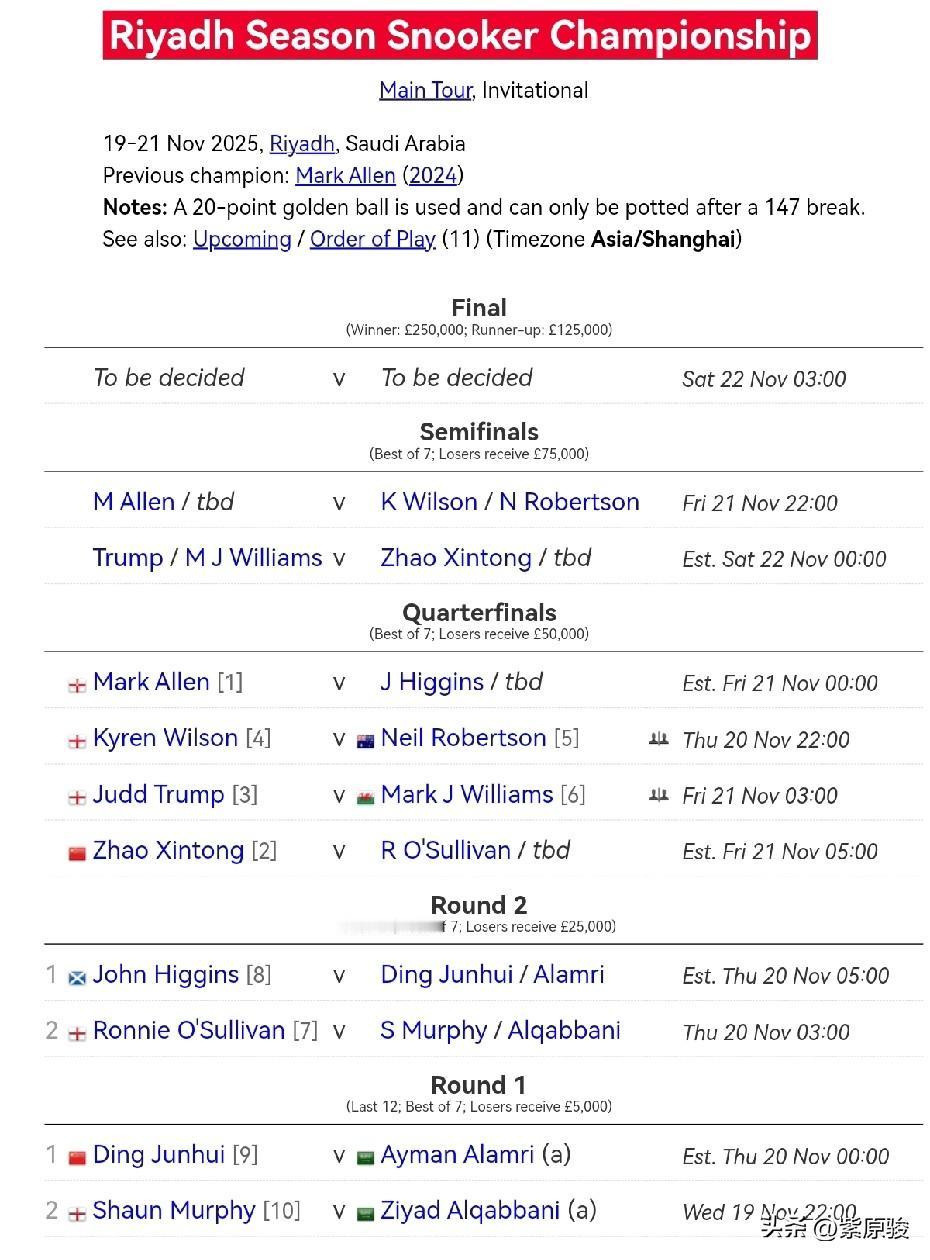 斯诺克巡回赛下一站——利雅得赛季锦标赛,时间是11月19日,世界排名前十的球员受邀,中国球员赵心童、丁俊晖参加。赵心童因为是新科世锦赛冠军,列为二号种子,直接晋级1/4决赛。卫冕冠军马克·艾伦是一号种子。 第一轮,丁俊晖和墨菲分别对阵两名沙特外卡选手,不出意外,将晋级第二轮。第二轮,丁俊晖迎战希金斯,墨菲迎战火箭奥沙利文。 不少中国球迷希望赵心童在1/4决赛中对阵火箭,不过这得看第二轮火箭能否过墨菲这一关。第二轮丁俊晖能不能过希金斯这一关说不好,因为是7局4胜胜负难料,但个人觉得丁俊晖略处下风。 本次比赛都是强强对话,看点很多,尤其决赛之前都采用7局4胜制,应该很刺激。其实,最大看点还是看谁能打出167。目前球员打出147次数很多,希望本次比赛先来一杆147,因为要打167,首先得打出147。打出167,可以拿到100万美元额外大奖,这是本次比赛最大的噱头,也是球员的动力之一。 本次比赛另一个看点就是高奖金。沙特确实有钱,第一轮输了也可以拿5000英镑,晋级第二轮2.5万英镑,晋级1/4决赛5万英镑,晋级半决赛7.5万英镑,亚军12.5万英镑,冠军25万英镑,确实诱人。去年,丁俊晖进了1/4决赛,张安达第二轮输给了布雷切尔。 利雅得赛季锦标赛是邀请赛,球迷就是看斯诺克顶尖高手们争夺奖金,当然如果能打出167就更刺激了。