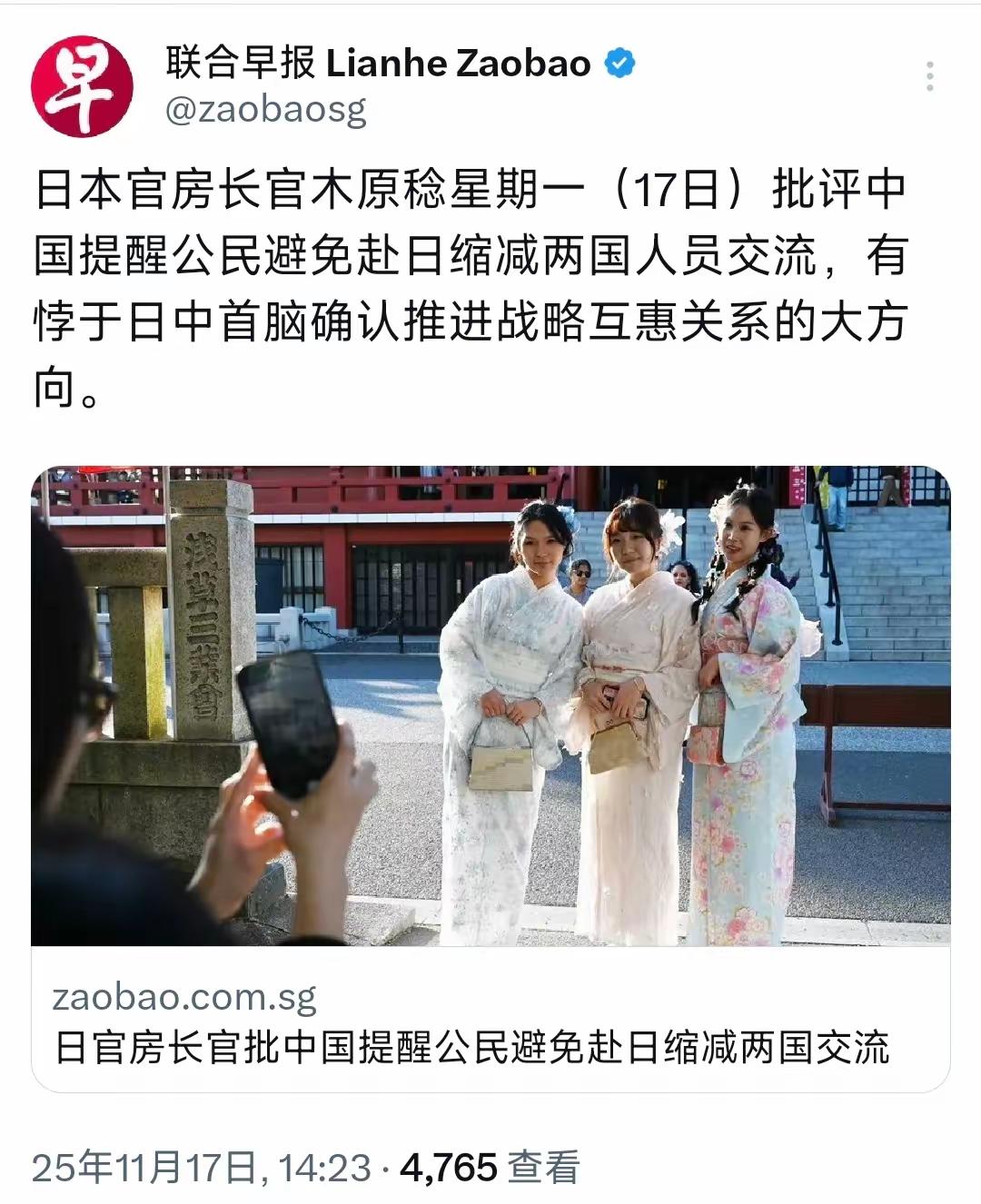 外媒今天(11月17日)报道:“日本官房长官木原稔星期一(17日)批评中国提醒公民避免赴日缩减两国人员交流,有悖于日中首脑确认推进战略互惠关系的大方向。” 多次说过,就像日本只说自己是核爆的“受害者”,却永远不说自己为什么被核爆一样,现在日本只说中国提醒本国公民避免赴日缩减两国人员交流,就是不提中国为何要这样,只要一种是在中国无理取闹。也多次说过,跟日本人不要谈,不要接触,它完全可以做到自说自话,在这方面赢不了日本。对日本,我们只做不说,也不解释,睡有问题让谁去问日本就好。