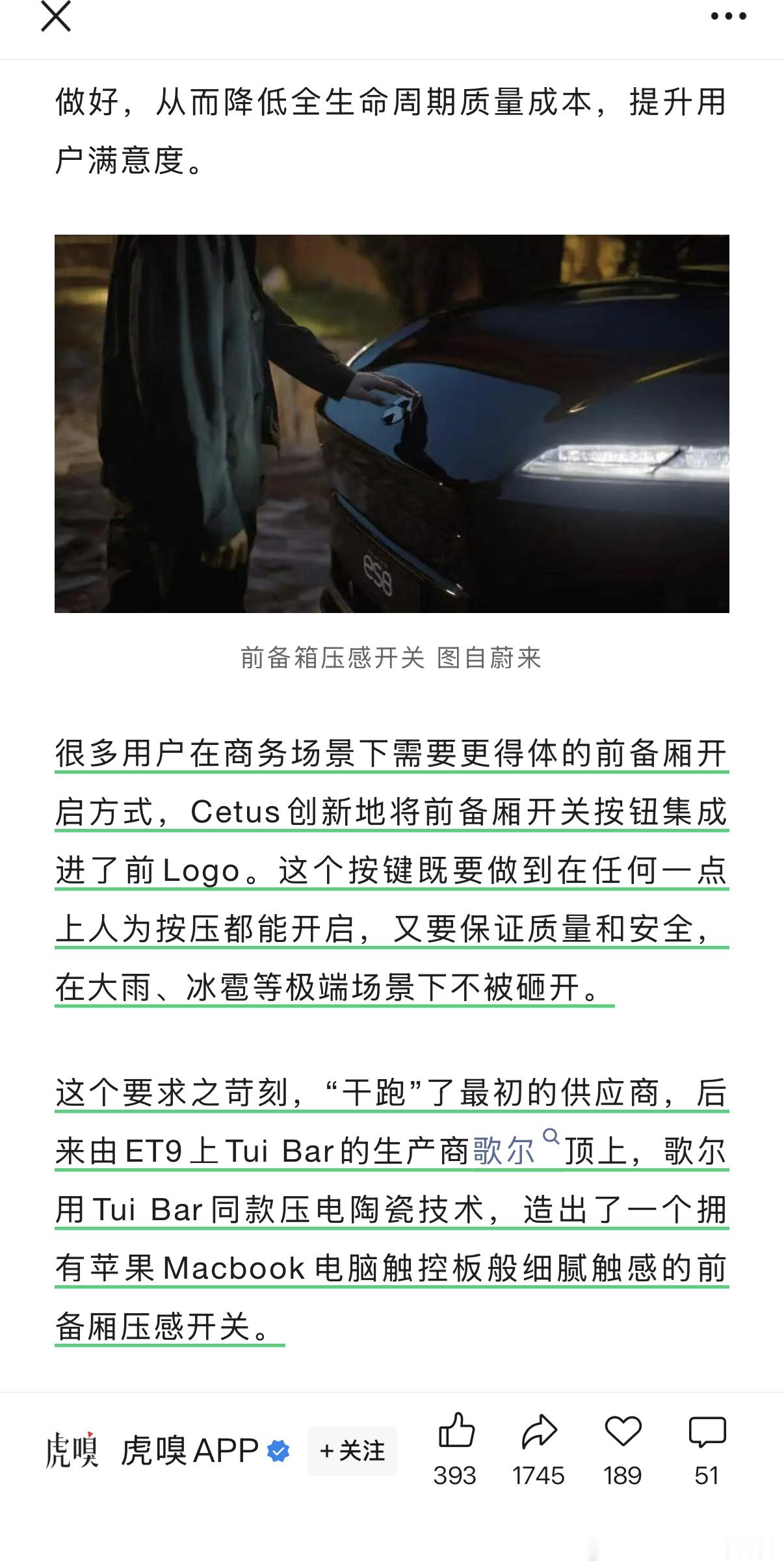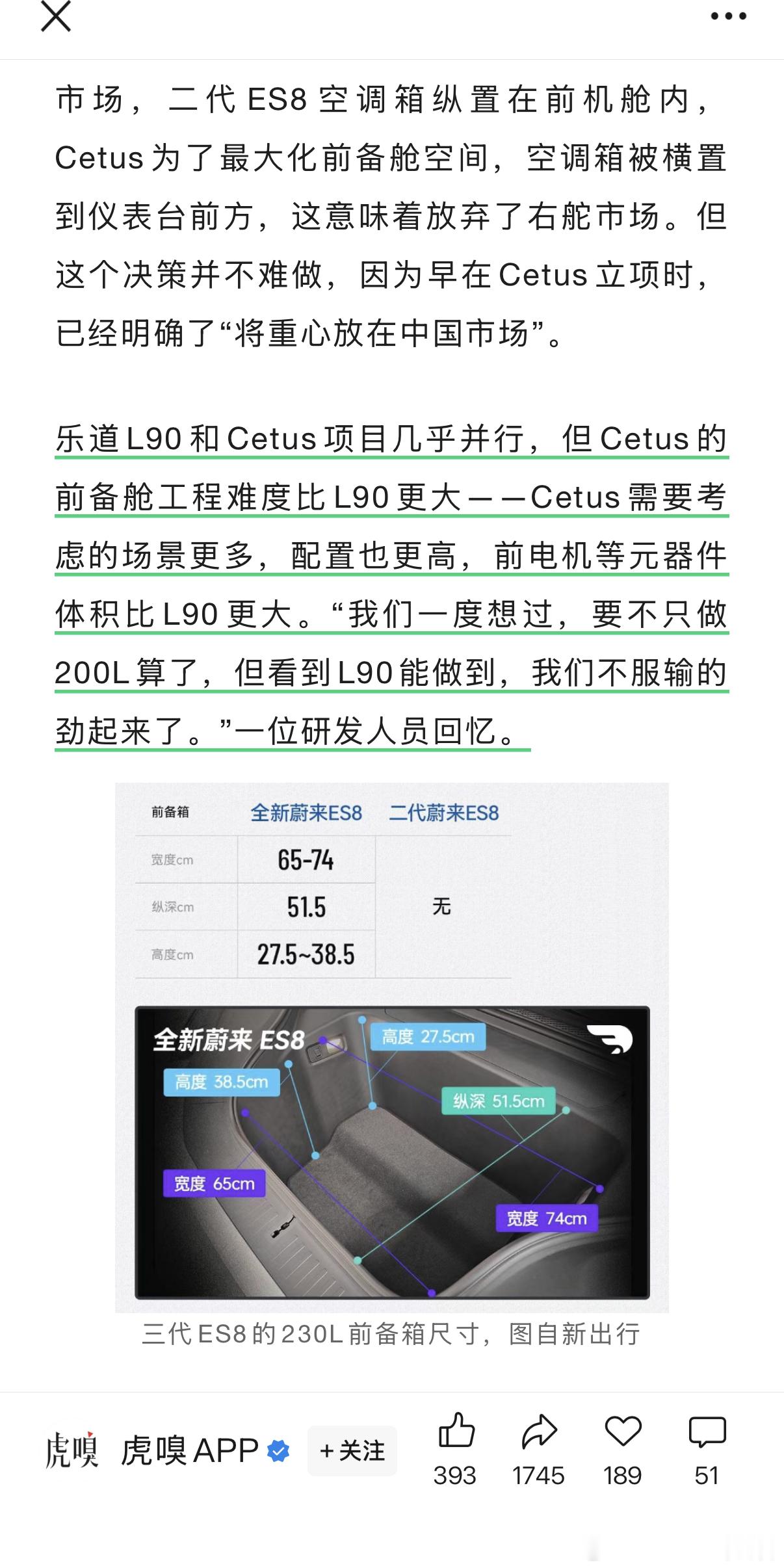 看到几个蔚来ES8研发期间的小故事:1、ES8曾考虑过做到车长5米4,配200度超大电池2、ES8的前备箱最初只能做200L,比乐道L90小40L3、为了实现前备箱按钮和LOGO二合一,干跑了一家供应商大家觉得,蔚来ES8能有今天的成绩,价格和产品力哪个更关键