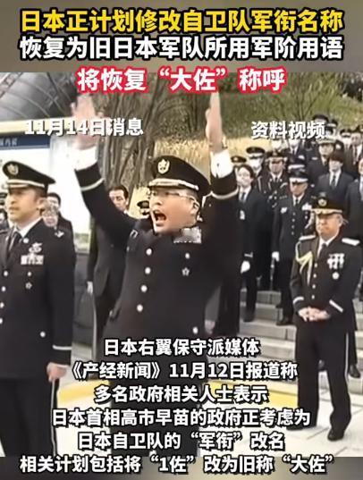 日本方面突然宣布了。   据多家日媒报道,日本准备把自卫队“1等陆佐”等数字称呼改回“大佐”等传统叫法,同时把“普通科”改成“步兵科”,目标是在2026财年前后完成,理由是与国际通行称谓对齐。     看似只是一次名称调整,但如果把它放到日本过去几年的军事动作里看,就会发现它并不简单。解禁集体自卫权、发展远程打击能力、防卫预算连年增加,这些步骤一直在推动日本突破和平宪法的限制。   而这次改名,就是在战后体制的根基上又撬了一下,为未来名正言顺地让自卫队变成军队提前铺路。     “步兵科”这个词,一旦放在军队体系中,就有明确的含义——它是负责地面进攻作战的主力,如果说“普通科”听着还有防御意味,那么“步兵科”就是主动前出、占领地面阵地的代名词。   这种转变透露出日本对自卫队职能定位的调整,他们已经不满足于仅在国土防御框架内活动,而是要把部队塑造成能够在海外作战、执行进攻任务的力量。     相比之下,“大佐”的改动更具争议性,这个军衔并不是国际通用的中性词汇,它是旧日本帝国军队的特有称号,与侵略战争紧密相连。   历史上,大量身着“大佐”肩章的日本军官曾在亚洲战场上指挥屠杀、掠夺和焚毁城市,对于中国以及其他受害国而言,这个词是沾满鲜血的,充满了痛苦记忆。   如今日本选择再次启用,而不是使用更多国际认可的中性称谓,这显然不是偶然,而是一种刻意的符号复活,是在让过往的侵略印记重新进入公共视野。     至于日本官方给出的“与国际接轨”理由,根本站不住脚,日本自卫队的英文军衔体系早已与美军和北约对标,在联合演习和国际交流中从未出现称谓障碍。   历史上,日本在二战前同样是通过一步步扩大军备、调整军队结构,最终走向全面侵略的,今天,他们的路径与当年相似度令人警惕。   对于中国以及亚洲其他国家来说,这不仅是名称变动,而是和平体系被一点点蚕食的信号,尤其是在当前地区局势复杂、军事摩擦加剧的背景下,这种符号复活极可能被用作舆论上的试探,观察外界反应,为更大的行动做准备。     日本的这一做法,无论披上多么漂亮的理由,最终的结果都是让自卫队和真正的军队之间的界限越来越模糊。我们在任何时候都不能忽视日本在军事方向上的连续动作,因为它可能意味着日本的那颗贼心在蠢蠢欲动。     你觉得日本这次的改动只是象征性的调整,还是在为更大的军事部署做准备呢?欢迎发表你的看法。