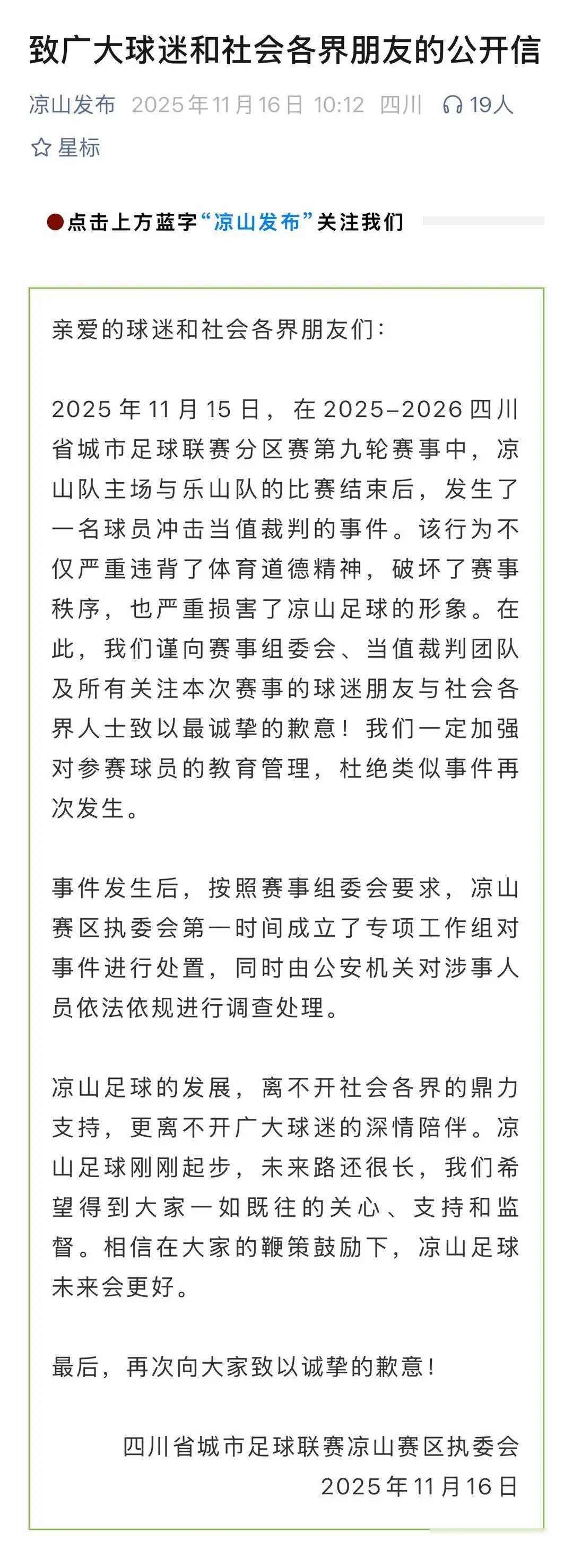川超凉山队队员赛后飞踹主裁,警方已介入调查,律师:或面临拘留、罚款与长期禁赛 11月15日傍晚,四川西昌一场足球赛刚结束,凉山队对乐山队,视频突然在网上传开,画面里一个凉山队球员冲向裁判组,抬脚踢了主裁后背,几个保安马上冲上来把他拖开,这场冲突发生在球员通道,现场一下子安静了。 第二天,凉山赛区执委会发了封公开信,说诚恳道歉,会严肃处理,一再提体育道德和球队形象,还说要管好球员,可不少球迷在评论里问,道歉能顶啥用,踢人的球员到底要停多久,。 记者联系了律师付建,他说这种暴力行为可能会被拘留,还要交罚款,根据足协的纪律规定,球员有可能被禁赛半年以上,最少得罚十万块,不过到底怎么处理,还得等警方把调查结果出来再说。 现在网上都在说,凉山队第一次参加省级联赛,这事说不定会影响他们整个赛季,有老球迷觉得,球员年轻,冲动在所难免,可这么砸自己球队的招牌,往后怎么在别的赛区立足,。 冲突升级,凉山球员赛后冲上去打裁判,足协怎么处理,大家都在看,现场球迷吵成一片,有人喊着要严办,有人觉得事出有因,法律界的人说这已经不是简单的违纪,可能涉及故意伤害,视频传开后,评论区炸了,有人转发,有人截图,有人报警,事情越闹越大,没人能再装作没看见。