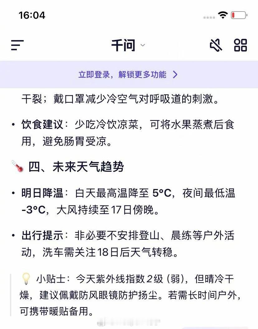 作为一个关注AI发展的博主,我自然是第一时间下载。今上班出门前我问了 该穿多少衣服,因为昨预报寒流降至。好家伙,给我整理了一篇穿衣指南。按照这个略作调整,出门是真的感觉良好。要说这千问,还真没有把它问住,回头再跟它细细交流。各位,你们安装 APP了吗?