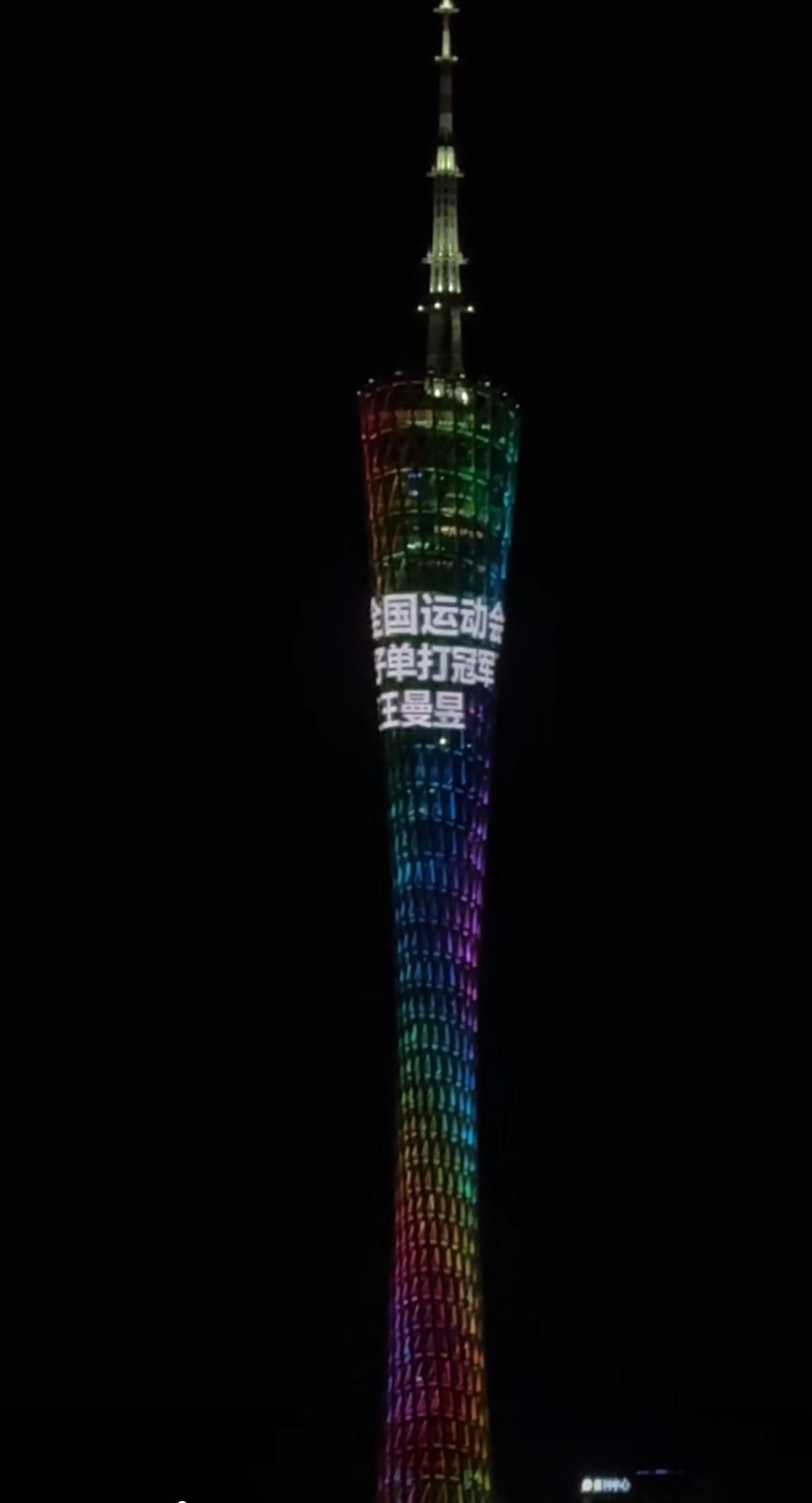广州塔上“播报”卫冕全运会女单冠军王曼昱——广州排面真到位 广州塔每天都会亮灯, 播报夺冠运动员的名字和代表的 省队,广州是主办方之一, 排面非常到位! 王曼昱太棒啦, 广州塔我也上去过, 看到曼昱的名字出现在塔上, 莫名跟着骄傲, 曼昱17年全运会单打3:4输给朱雨玲,赛后哭着说“我还年轻, 还可以再来!” 这一个再来, 一下子就是连续两届冠军🏆, 太牛啦!