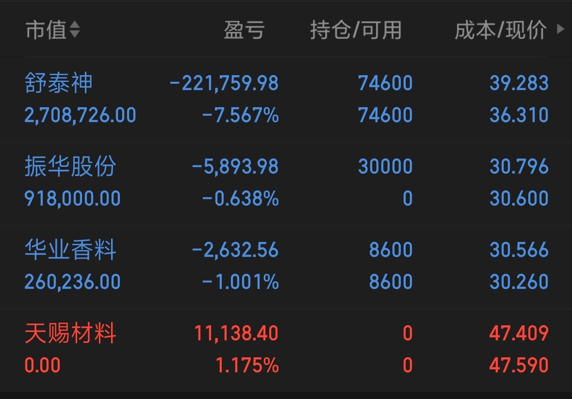 今天大盘还是跌一点,个股表现还算可以,特别是创业板,今天很多大涨个涨停的,自己的创业板,舒泰神今天跌了七个多点,我个人选择先观察一两天,所以今天没跑,继续持有,炒股嘛,亏就是亏,我不是单单炒一天今天卖出了,天赐材料,下午尾盘进了振华股份,继续持有华业香料,