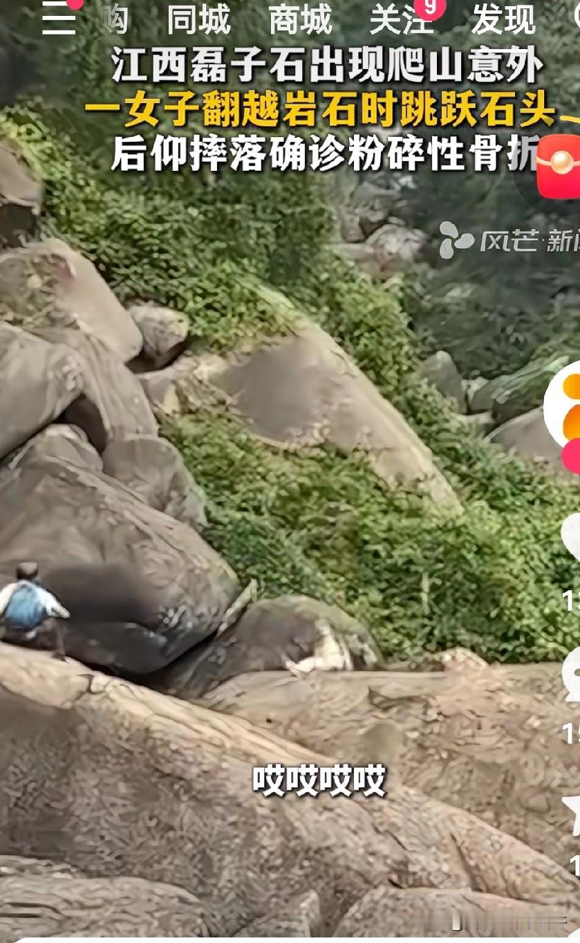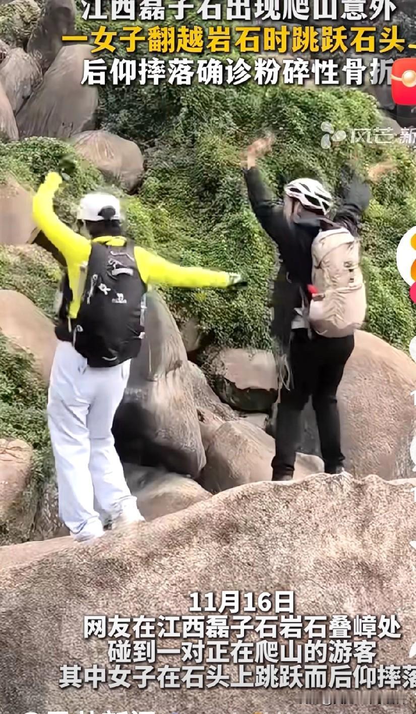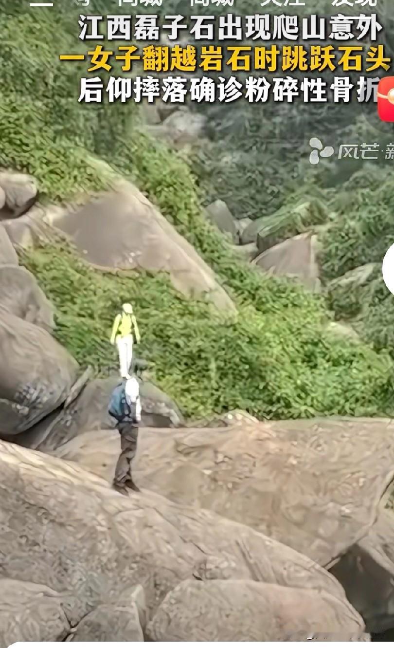还扭不扭了?还跳不跳了? 有个欠了网贷四百多万的体制内帅哥说过一句话: 那种平平淡淡的日子就是最好的时光,不要毫不在意的破坏它,等到妻离子散才知道什么都晚了! 看山西磊子石这位女子本来身体健康还能登山,多年幸福的日子!登上山稳当的照相也罢了,同行的让她扭一扭,扭就扭!她还要跳一个!从上面的岩石往下面的跳。 野外生存技能和我们日常生活城市有天壤之别,我们都被现代优越的生活条件废了很多敏捷和聪明。所以跳的时候你注意下面石头滑不滑?两个石头中间有没有深沟? 都没看吧!来,我给你表演个跳一个,直接摔下去了,骨折了! 至于哪个部位骨折我也没细看,反正救援的上去了。即使不致命也得一百天吧? 珍惜活蹦乱跳的能吃能喝的日子吧!野外不是广场,去看看老虎狮子就知道我们很多能力退化了[笑哭] 第一张照片扭一下第二张是滚下去了,第三张我给你跳一个!