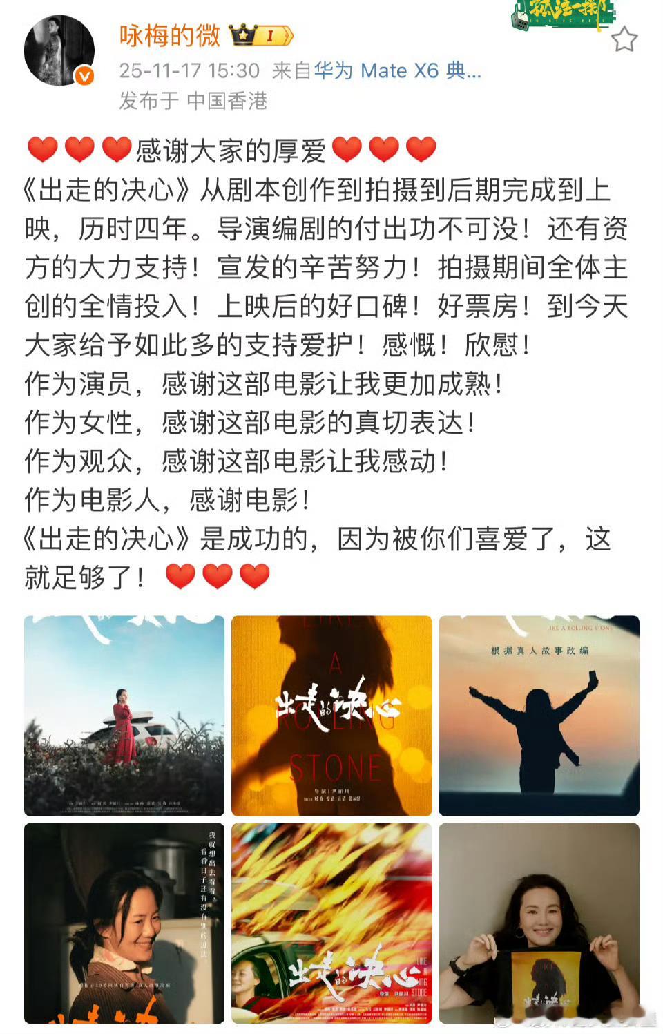 咏梅这波操作太飒了!金鸡奖后淡定发文:新的一天该有的都会有。网友喊话“给她一个影后!”《出走的决心》演技炸裂,优雅外表藏着叛逆灵魂