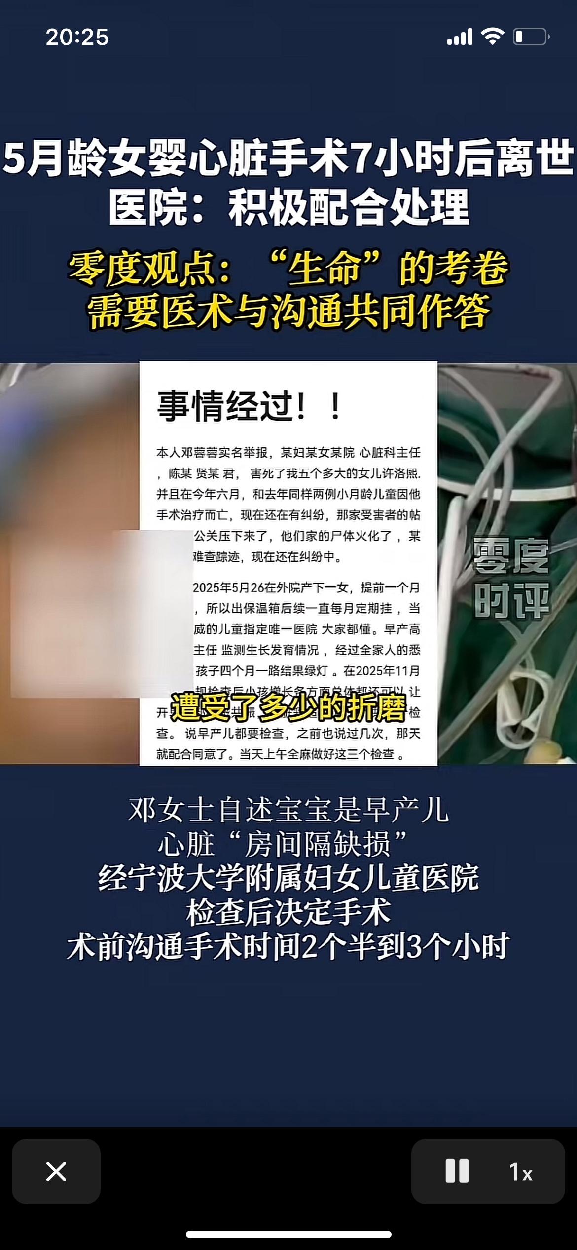 5月龄女婴心脏术后7小时离世,这事儿扎得人心疼——更让人寒心的是,这可能不是个例。 家长说术前沟通手术只要2个半到3小时,结果做了7小时;还曝出去年已有两例小月龄患儿术后离世,家属的诉求被“公关压下”。早产宝宝本身就脆弱,家长把孩子托付给医院,赌的是信任,可这信任换来的是“积极配合处理”的官方说辞? 手术有风险,但风险不该是“沟通模糊+事后沉默”的遮羞布。医院的考卷里,“医术”是基础,“真诚”才是及格线——连家属最该知道的信息都遮遮掩掩,怎么让下一个家庭敢把孩子交过来? 你觉得,这种时候“积极配合”该怎么落地?是先给家属一个透明的真相吗?