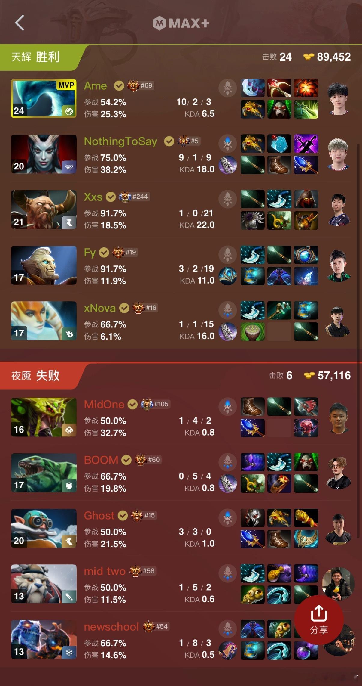 赛后评分,Xnova最高,Ame最低,Ame这把不仅多次走位失误,这个出装也是有