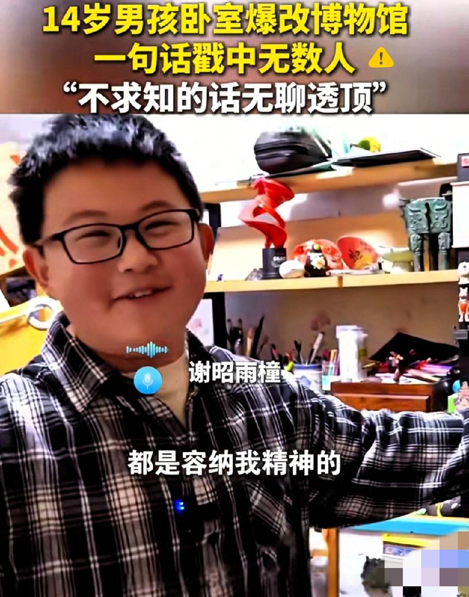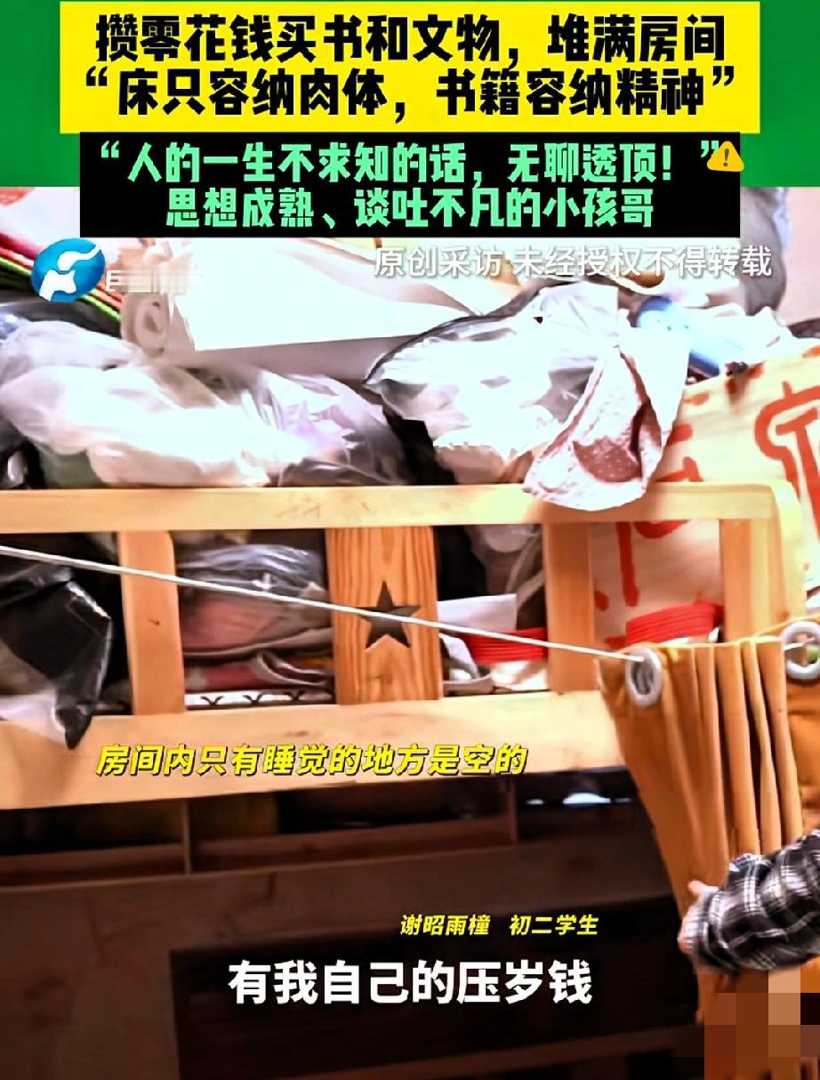 14岁男孩把卧室改成“博物馆”! 郑州初二生谢昭雨橦的操作,真的让全网忍不住点赞! 别的孩子攒零花钱买玩具、吃零食,他却一门心思收书籍、淘文物,袜子破了洞都舍不得换,直言“物质够用就好,精神富足才重要”。 不大的房间里,床以外的地方全被汉代陶片、洛阳汉砖、北宋白瓷片这些宝贝堆满,还有满满当当的中外文学书,他给这里取名“雨堂博物馆”,眼神坚定地说“床容纳肉体,剩下的都装着我的精神”。 比起同龄人的贪玩浮躁,这孩子的通透和坚持太难得! 现在太多人追求即时快乐,却忘了沉下心积累的力量,谢昭雨橦用行动告诉我们,真正的热爱能抵岁月漫长,精神富足远比物质堆砌更有价值。 少年的眼界藏着未来的高度,这样的孩子未来真的不可限量! 你身边有这么有想法的少年吗?快来聊聊你对这份“硬核爱好”的看法~