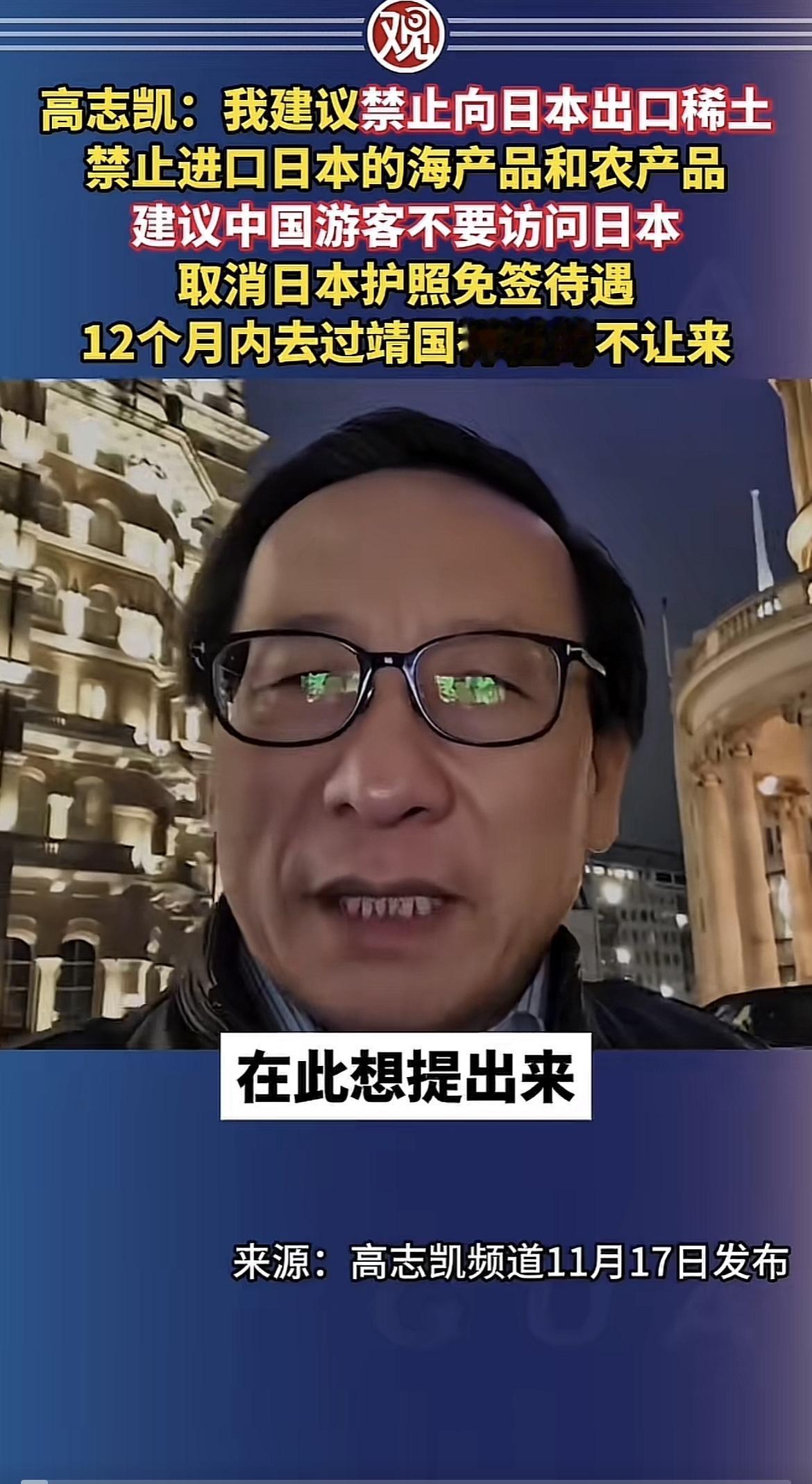 高志凯建议,鉴于日本首相高市早苗胡言乱语,严重践踏我们的红线,提出以下建议: 禁止向日本出口稀土,禁止停止进口日本水产品,禁止中国向日本出口我们的农产品,日本人进入中国要重新办证,不经允许不能进入中国等等。 ——这些话,听着是不是挺解气?可问题来了:一旦日本继续“挑事”,中国到底能怎么接招、怎么还手,更能让对方记得久一点? 第一,日本最近这一系列动作不是偶然。 从核污染水排海,到频繁炒作周边局势,再到高市早苗上任后的连番言论,说白了,就是想借着外部矛盾为自己内政“找出口”。 经济不振,产业外流,社会焦虑,日本必须找点“外部敌意”来转移注意力。 第二,中国完全有手段。 稀土是战略资源,全球七成以上的稀土深加工能力在中国手里。 别说日本,连美国都多次公开承认对中国稀土供应链高度依赖。 这一项动动,就足以让某些国家“思考人生”。 第三,日本水产品的问题,中国已经有明确政策。 这是基于科学检测和消费者安全的决定,不是情绪化操作。 一旦未来情况变化,中国还有空间、有节奏、有分寸地调整工具箱。 第四,日本最怕的不是“强硬”,而是“可预期的硬”。 俄罗斯试射一次导弹,东京立刻老实。 为什么? 因为他们知道:对手不是玩虚的。 中国不需要摆动作,但我们手上有底牌、有耐心、有实力,这反而让人更不敢轻举妄动。 第五,最关键的还是我们自己。 底气从哪来? 从产业链,从科技,从经济,从14亿人的共同努力。 台海也一样,真正让局势稳住的,从不是别人,而是大陆自己的发展速度和战略定力。 总结一句: 外部风声再大,只要我们稳住节奏,就没人能左右我们未来。 各位读者怎么看?欢迎在评论区讨论。