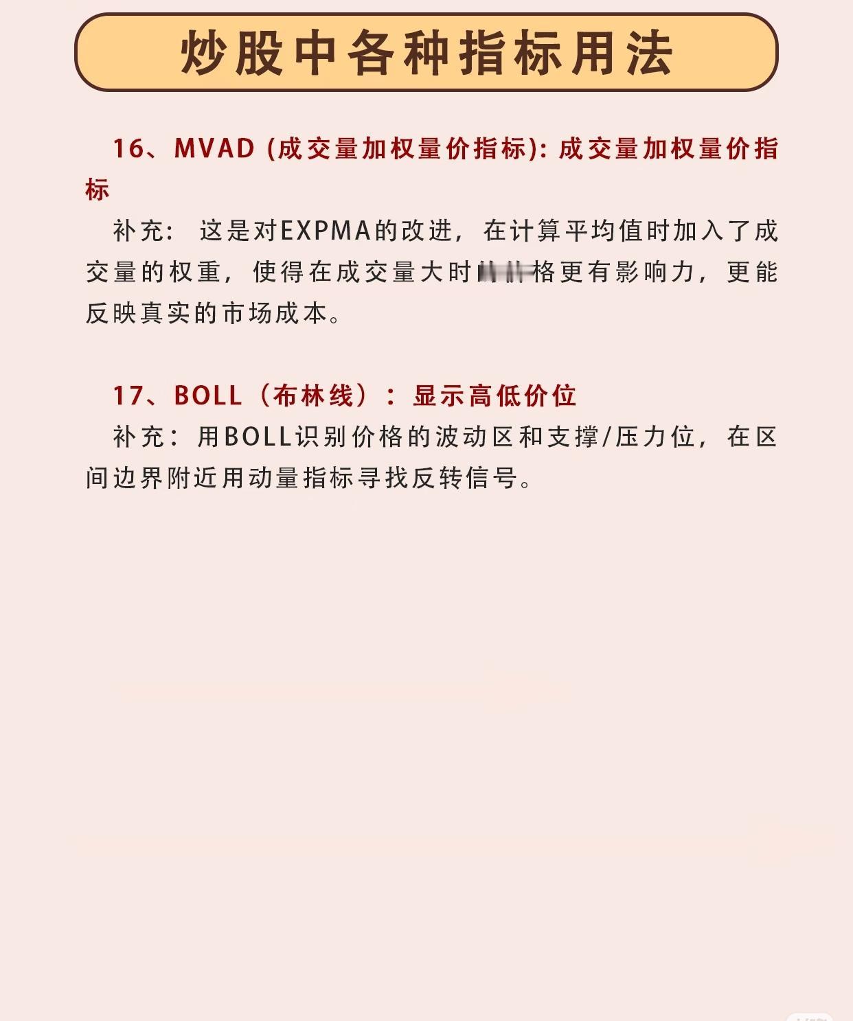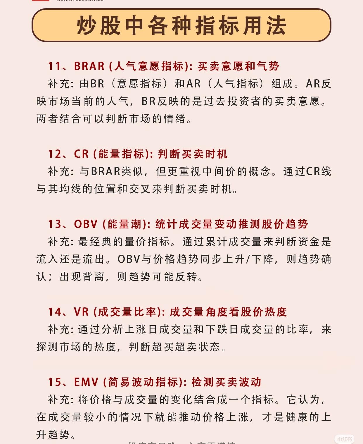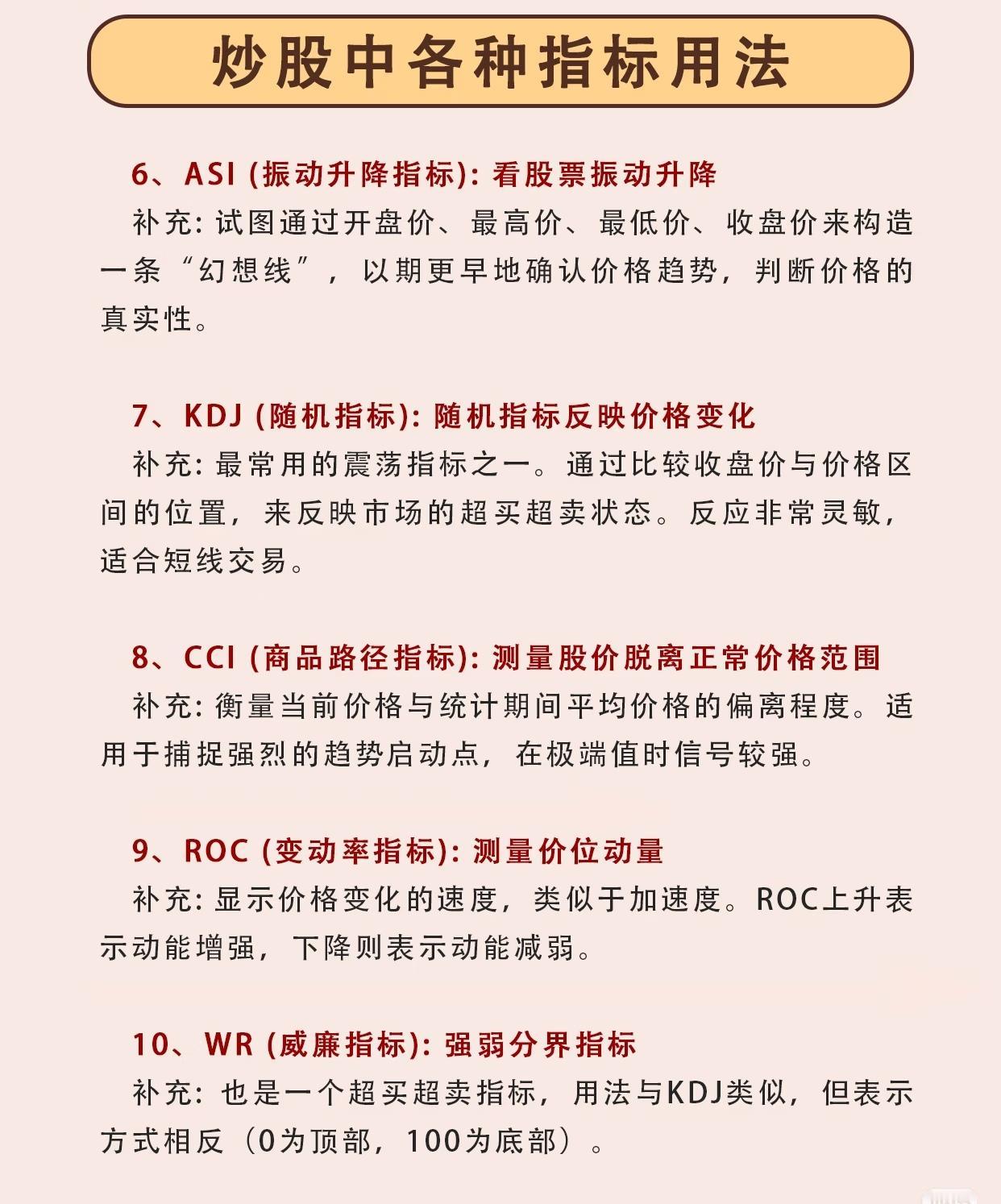 关于炒股常用技术指标用法的学习资料,共介绍了17种常见的技术指标,每种指标都附有简要说明,帮助投资者理解其用途和特点,以便在实际操作中辅助判断趋势、买卖信号以及市场情绪等。 1–5. 基础趋势类指标: - DMA(平行线差指标):通过两条均线的交叉和方向判断趋势,较为简洁,适合看趋势。 - MACD(指数平滑异同移动平均线):最核心的趋势指标之一,用于判断中长线趋势的强度、方向与转折(如金叉、死叉)。 - TRIX(三重指数平滑平均线):专为捕捉长期趋势设计,信号稳定但略有滞后,能过滤短期波动。 - DMI(趋向指标):不仅判断趋势,还通过+DI与-DI的交叉给出买卖信号,并利用ADX线判断趋势强弱。 - EXPMA(指数平均数):对股价近期和远期数据赋予不同权重,比普通均线更灵敏,常作为动态支撑或阻力位。 6–10. 震荡与超买超卖类指标: - ASI(振动升降指标):通过开盘、最高、最低、收盘价构造“幻想线”,用于更早确认价格趋势,判断价格真实性。 - KDJ(随机指标):最常用的震荡指标之一,通过收盘价与价格区间的相对位置反映超买超卖,反应灵敏,适合短线交易。 - CCI(商品路径指标):衡量当前价格与统计期间均价的偏离程度,用于发现强烈趋势的启动点,极端值时信号较强。 - ROC(变动率指标):反映价格变化的速度(类似加速度),上升代表动能增强,下降则动能减弱。 - WR(威廉指标):也是超买超卖指标,与KDJ类似但表现方式相反(0为顶部,100为底部)。 11–15. 情绪、能量与量价类指标: - BRAR(人气意愿指标):由反映市场人气的AR和反映过去买卖意愿的BR组成,两者结合可判断市场整体情绪。 - CR(能量指标):重视中间价,通过CR线与其均线的位置和交叉判断买卖时机。 - OBV(能量潮):经典量价指标,通过累计成交量判断资金流向,若与价格趋势同步则趋势确认,背离则可能反转。 - VR(成交量比率):通过上涨日与下跌日成交量的比率,探测市场热度,判断超买超卖状态。 - EMV(简易波动指标):结合价格与成交量,认为小成交量推动价格上涨才是健康上升趋势,用于检测买卖波动。 16–17. 改进型与综合类指标: - MVAD(成交量加权量价指标):在EXPMA基础上引入成交量权重,使大成交量时的价格影响更大,更真实反映市场成本。 - BOLL(布林线):通过计算股价的标准差形成上下轨,用于识别价格的波动区间、支撑与压力位,可在区间边界配合动量指标寻找反转信号。 总体来看,这些指标从不同角度辅助投资者分析股票走势,包括趋势判断、买卖信号、超买超卖、市场情绪、成交量分析等,可根据投资风格(如短线或长线)和策略需要选择合适的指标组合使用。