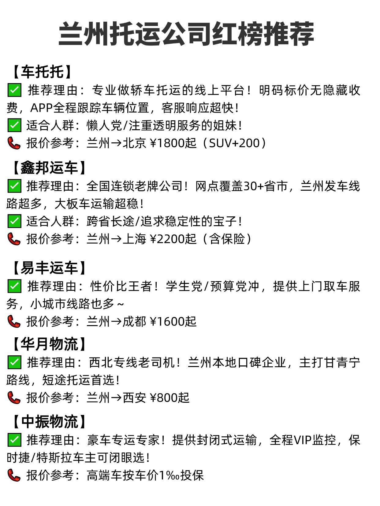 跨省搬家/异地工作/自驾游返程,爱车托运简直刚需!作为在兰州托运过3次车的“老司机”,今天掏心窝子分享 5家亲测靠谱的托运公司+发运地点+安全避坑攻略,小白必看!👇 🌟 兰州托运公司红榜推荐 (排名不分先后,按需求选!) 【车托托】 ✅ 推荐理由:专业做轿车托运的线上平台!明码标价无隐藏收费,APP全程跟踪车辆位置,客服响应超快! ✅ 适合人群:懒人党/注重透明服务的姐妹! 📞 报价参考:兰州→北京 ¥1800起(SUV+200) 【鑫邦运车】 ✅ 推荐理由:全国连锁老牌公司!网点覆盖30+省市,兰州发车线路超多,大板车运输超稳! ✅ 适合人群:跨省长途/追求稳定性的宝子! 📞 报价参考:兰州→上海 ¥2200起(含保险) 【易丰运车】 ✅ 推荐理由:性价比王者!学生党/预算党冲,提供上门取车服务,小城市线路也多~ 📞 报价参考:兰州→成都 ¥1600起 【华月物流】 ✅ 推荐理由:西北专线老司机!兰州本地口碑企业,主打甘青宁路线,短途托运首选! 📞 报价参考:兰州→西安 ¥800起 【中振物流】 ✅ 推荐理由:豪车专运专家!提供封闭式运输,全程VIP监控,保时捷/特斯拉车主可闭眼选! 📞 报价参考:高端车按车价1‰投保 📍 兰州发运地点大全 别跑空!这些地方都能发车👇 大型物流园:东岗物流园、西固货运中心(大板车集散地) 火车站附近:兰州站货运场、兰州西站物流点 新区枢纽:兰州新区综合保税区(发往沿海城市专线多) 上门取车:提前24h预约,公司派板车到家门口!(部分公司收费¥100-200) 🔒 托运前必做安全措施! 划重点!避免磕碰纠纷全靠这些细节! 证件备份:行驶证复印件随车放,原件自己带! 车辆检查: 📸 360度拍视频:记录划痕、里程、油表(双方签字确认); 🚫 清空物品:后备箱不留贵重物!易燃品/香水/充电宝必须拿走; 🔋 断电处理:拔掉行车记录仪,防止电瓶亏电。 保险购买: ➠ 公司必须提供独立汽车托运保险!保额按车辆估值定(别接受笼统货物险!) 合同细节: ➠ 写明送达时间+赔付标准!延迟超过3天可索赔~