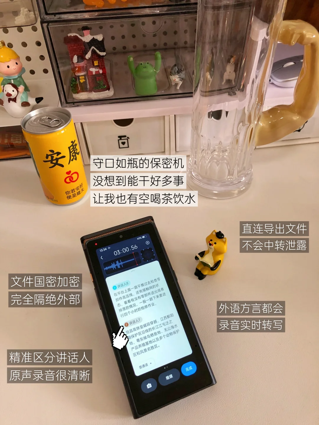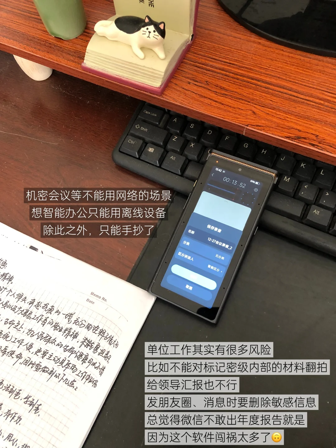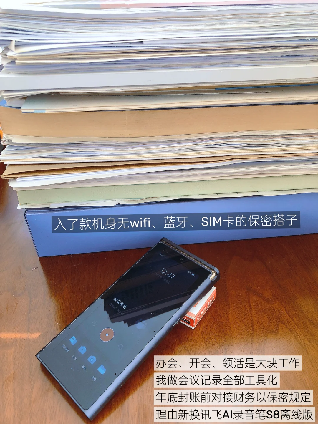 机密会议等不能网络的场景,想高效办公,可用机身无wifi、蓝牙、SIM卡的讯飞AI录音笔S8离线版,锁屏密码和文件国密加密的双重保险,完全隔绝外部。除此之外,只能手抄手写了。单位上买一般都能报办公费!有需求直接去财务采购申请!