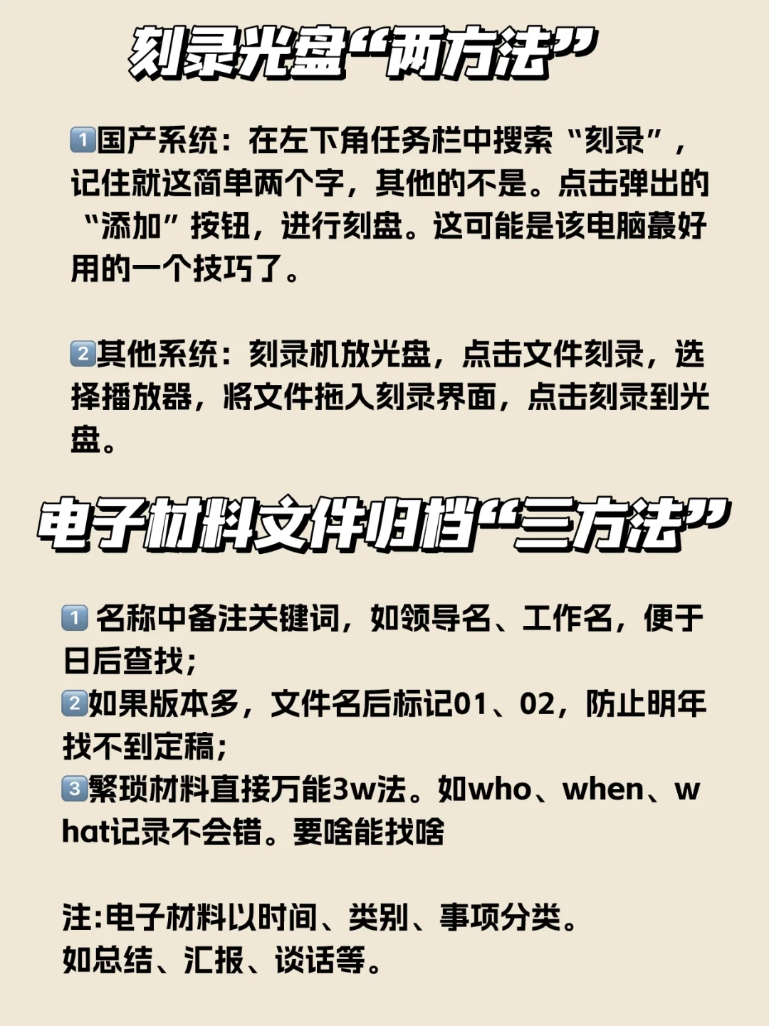 电子材料以时间、类别、事项分类。如总结、汇报、谈话等。一要名称中备注关键词,如领导名、工作名,便于日后查找;二是版本多,文件名后标记01、02,防止明年找不到定稿;三是繁琐材料万能3w法。如who、when、what不出错。要啥能找啥