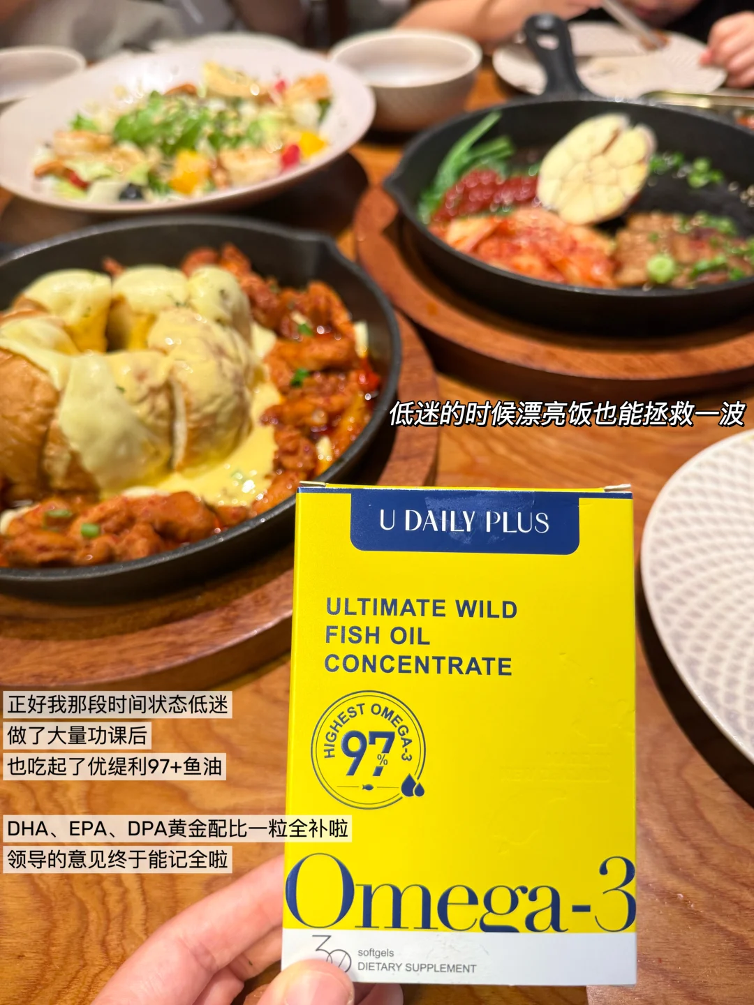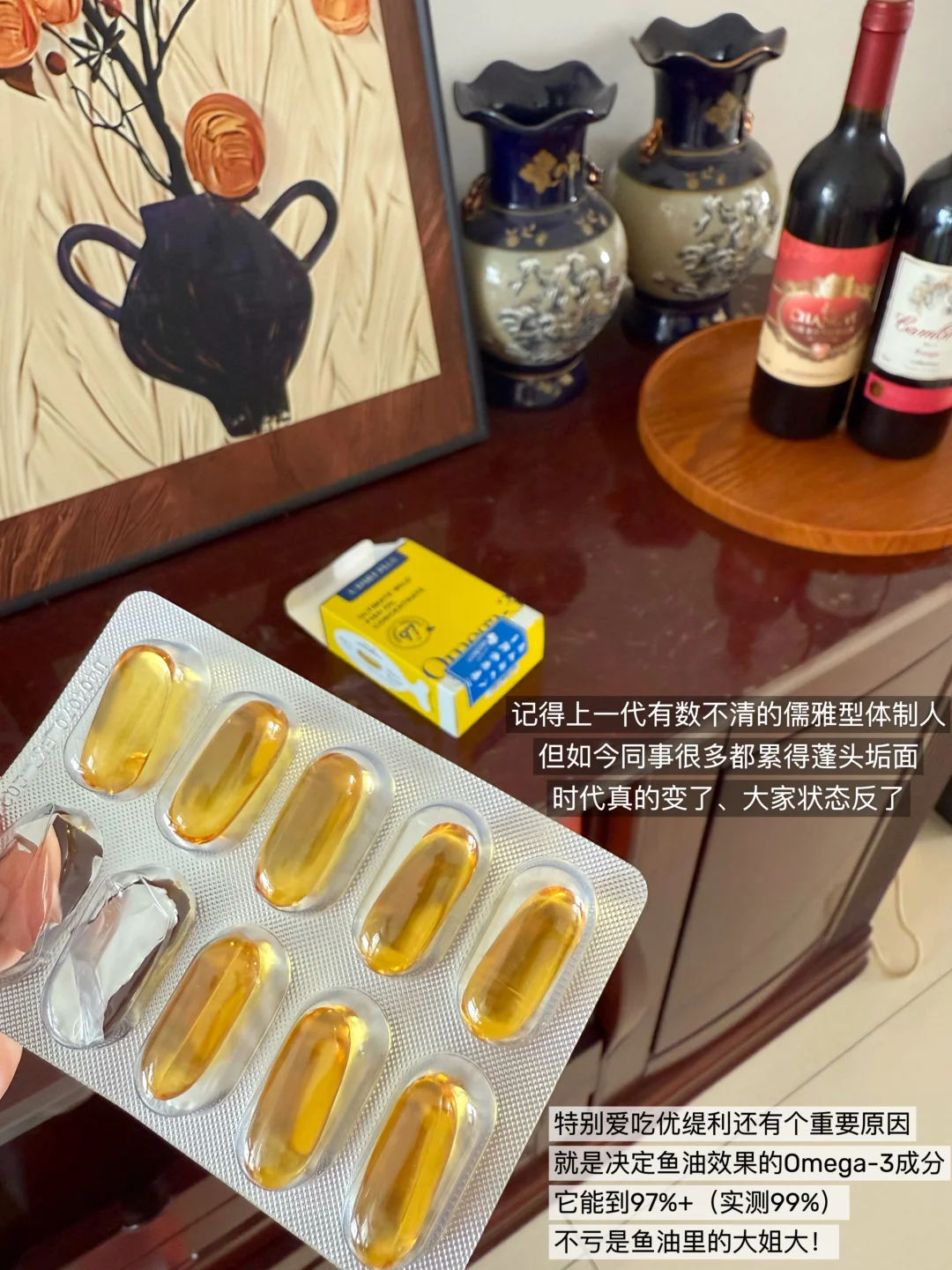 正好我那段时间状态低迷,做功课后也吃起了优缇利97+鱼油。它真是职场好搭子,DHA、EPA、DPA黄金配比一粒全补啦,领导的意见终于能记全啦。特别爱吃优缇利还有个重要原因,就是决定鱼油效果的Omega-3成分,它能到97%+(实测99%)是市面天花板了[哇R]不亏是鱼油里的大姐大!