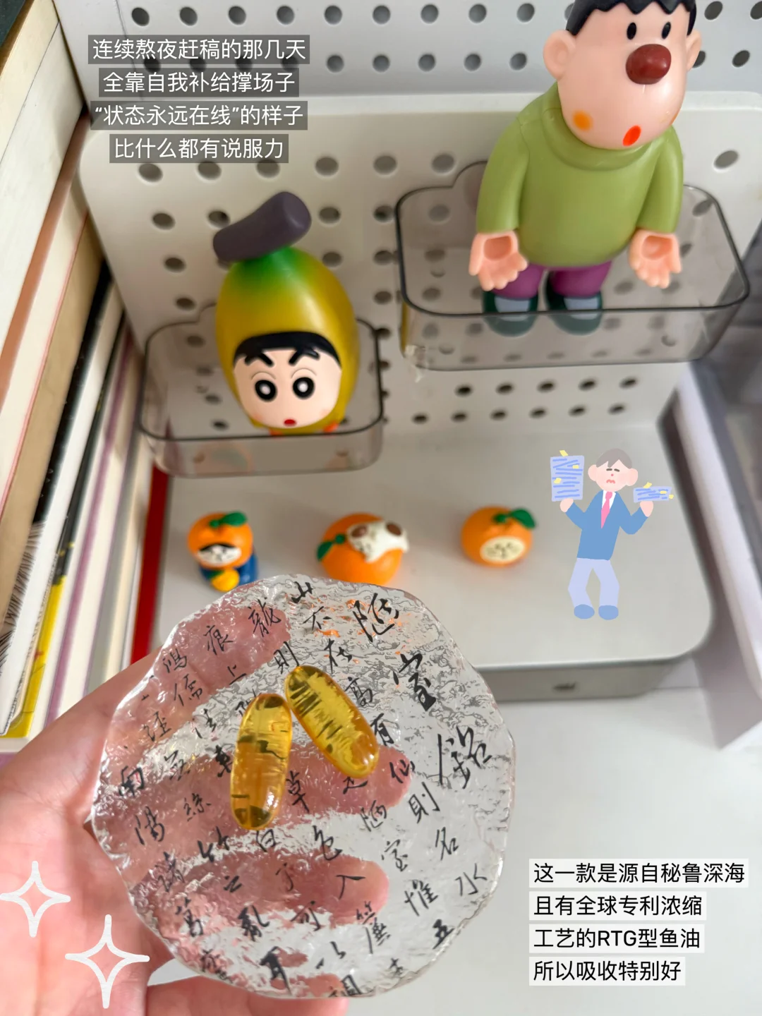这一款是源自秘鲁深海、且有全球浓缩工艺的RTG型鱼油,所以吸收特别好。连续熬夜赶稿的那几天,全靠它撑场子。“状态永远在线”的样子,比什么都有说服力