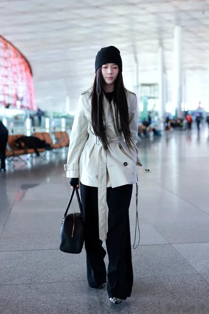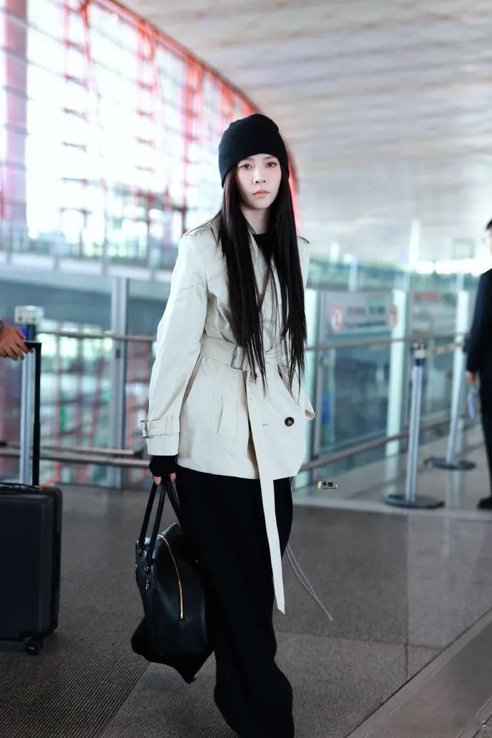宋妍霏机场私服真时髦!穿收腰风衣+直筒裤+针织帽,洋气又高级!
