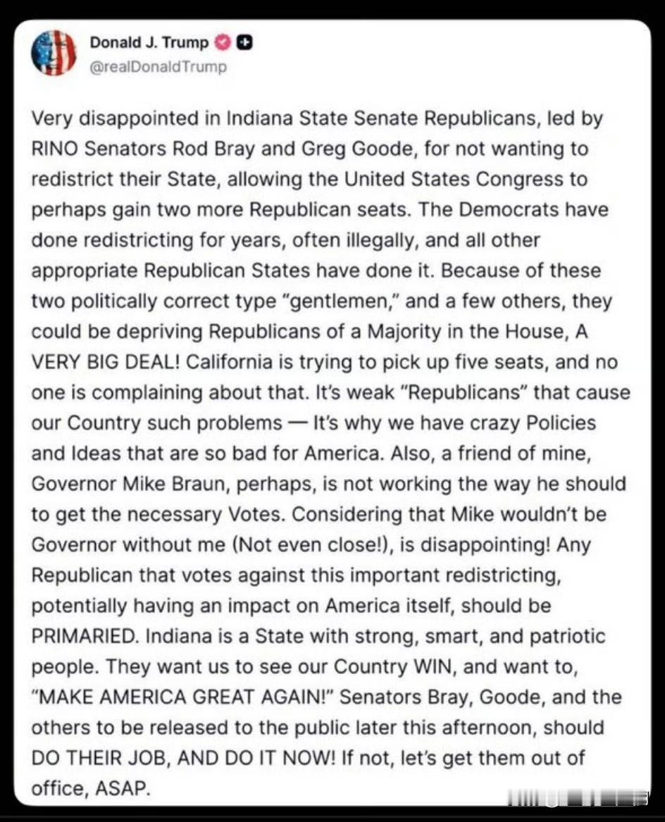 特朗普刚刚公开指责印第安纳州的共和党建制派人士罗德·布雷和格雷格·古德,称他们保住了两个民主党众议院席位。 他说他今天晚些时候会点名批评其他人。 印第安纳州即将迎来初选季,整个"让美国再次伟大"(MAGA)运动将会让这些名义上的共和党人(RINO)因背后捅刀而臭名昭著。