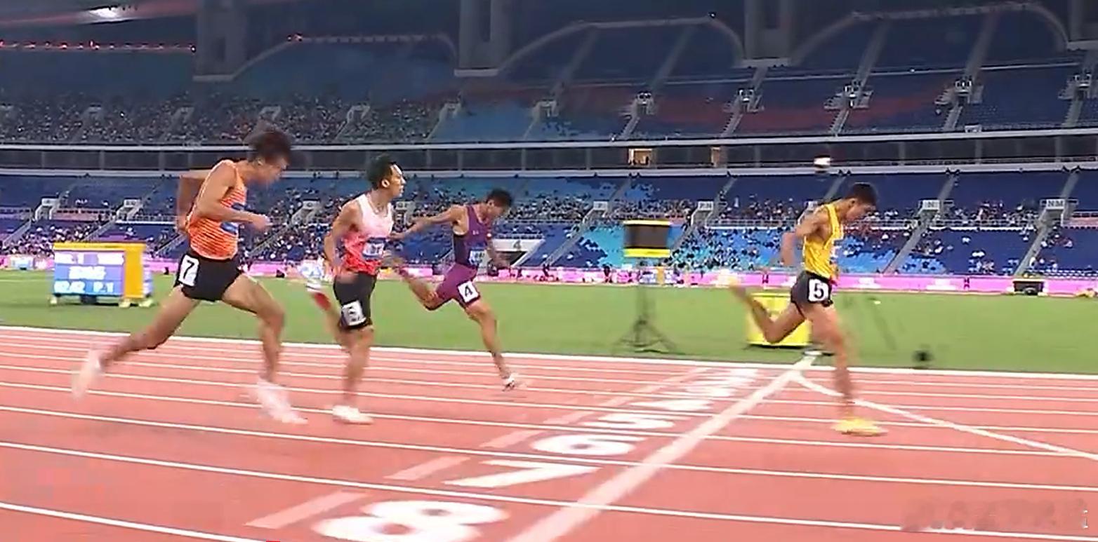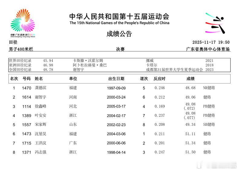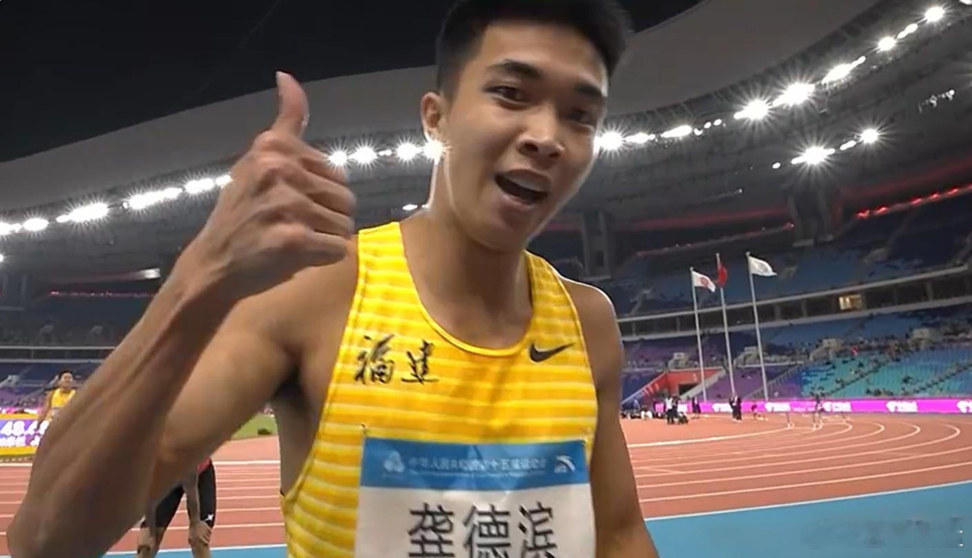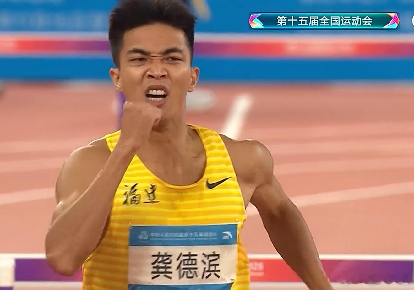 福建悍将夺全运男400米栏冠军破全国纪录 本届决赛首现计算千分秒决奖牌11月17日晚,全运田径大项结束了男子400米栏决赛争夺,福建选手龚德滨以48秒68获得冠军,打破河南选手谢智宇在2023年创造的48秒78的全国纪录。谢智宇以49秒06获得亚军,河北选手徐鑫峰和浙江选手叶安安同时跑出49秒08的个人最好成绩。计算千分秒,徐鑫峰以49秒072、0.005秒的优势战胜叶安安,获得季军。本届全运田径大项的决赛赛事,还是第一次出现要靠计算千分秒决奖牌归属。龚德滨今年全国锦标赛输给谢智宇获得亚军,全国冠军赛输给宋爱辉再次获得亚军。这次在全运会上得到超额弥补。比赛开始后,中间道次的谢智宇和龚德滨体现出一定优势,但不明显。转入最后的直道,前五名选手靠得非常近!在冲倒数第二个栏时,龚德滨才开始略微崭露头角。在攻击最后一个栏时,高速飞奔的龚德滨已经完全从重围中杀出!龚德滨第一个杀过终点,看到自己成绩后,龚德滨翘起大拇指为自己点赞!在今年大奖赛重庆站比赛里,龚德滨跑出此前个人最佳49秒01,全运会的突破幅度可谓惊人。亚军争夺非常激烈,谢智宇有被徐鑫峰和叶安安从两侧超越的危险。但谢智宇玩命冲刺,还是提前一点点到达终点。谢智宇49秒06、0.02秒的优势拿下不容易的银牌。