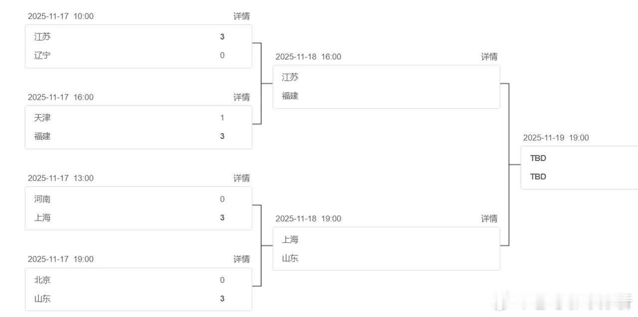 全运会女排4强出炉!卫冕冠军天津爆冷无缘 朱婷未率河南再创奇迹 全运会女排成年组四强已经出炉:江苏、福建、上海、山东,换言之朱婷所在的河南与李盈莹所在的天津都无缘四强,天津女排还是2021年陕西全运会的冠军,也就是卫冕冠军无缘四强。半决赛:江苏VS福建、山东VS上海。北京、河南、天津、辽宁等队会去打5-8排位赛。天津女排1-3不敌福建女排,四局比分:27-29、25-20、18-25、27-29。这场比赛双方的争夺非常精彩,庄宇珊、李盈莹这两位国家队一队的边攻手强强对决,很明显脚踝伤势刚刚痊愈的李盈莹略逊一筹,庄宇珊第一局就狂砍13分为福建奠定胜利的基调,福建女排创造最近28年最好成绩。值得一提的是本赛季李盈莹、庄宇珊都要去意大利打球,这两人的对轰场面会在意甲延续下去,两位超级边攻手未来肯定会更强江苏3-0辽宁,三局比分:25-14、25-18、25-20,可以说江苏队一直压着辽宁队打,张常宁、吴梦洁、刁琳宇、龚翔宇、倪非凡都是国家队一队的成员,江苏有半支国家队硬实力非常强劲,江苏队至今7连胜未尝一败。河南女排0-3惨败上海女排,三局比分:19-25、19-25、17-25。这场比赛朱婷33扣13中+1失误被拦仅拿13分,而仲慧都拿到15分,上海队是三人得分上双,赛后朱婷拒绝采访,虽然朱婷已经带领河南进入全运会八强创造队史最好成绩,但未能进入四强还是让朱婷有些难过。北京队0-3惨败山东队,三局比分:14-25、17-25、13-25,这场比赛北京队全程被山东队压着打,车文涵、杜清清、杨涵玉、王梦洁都是国字号选手,这支山东队的实力也不俗。