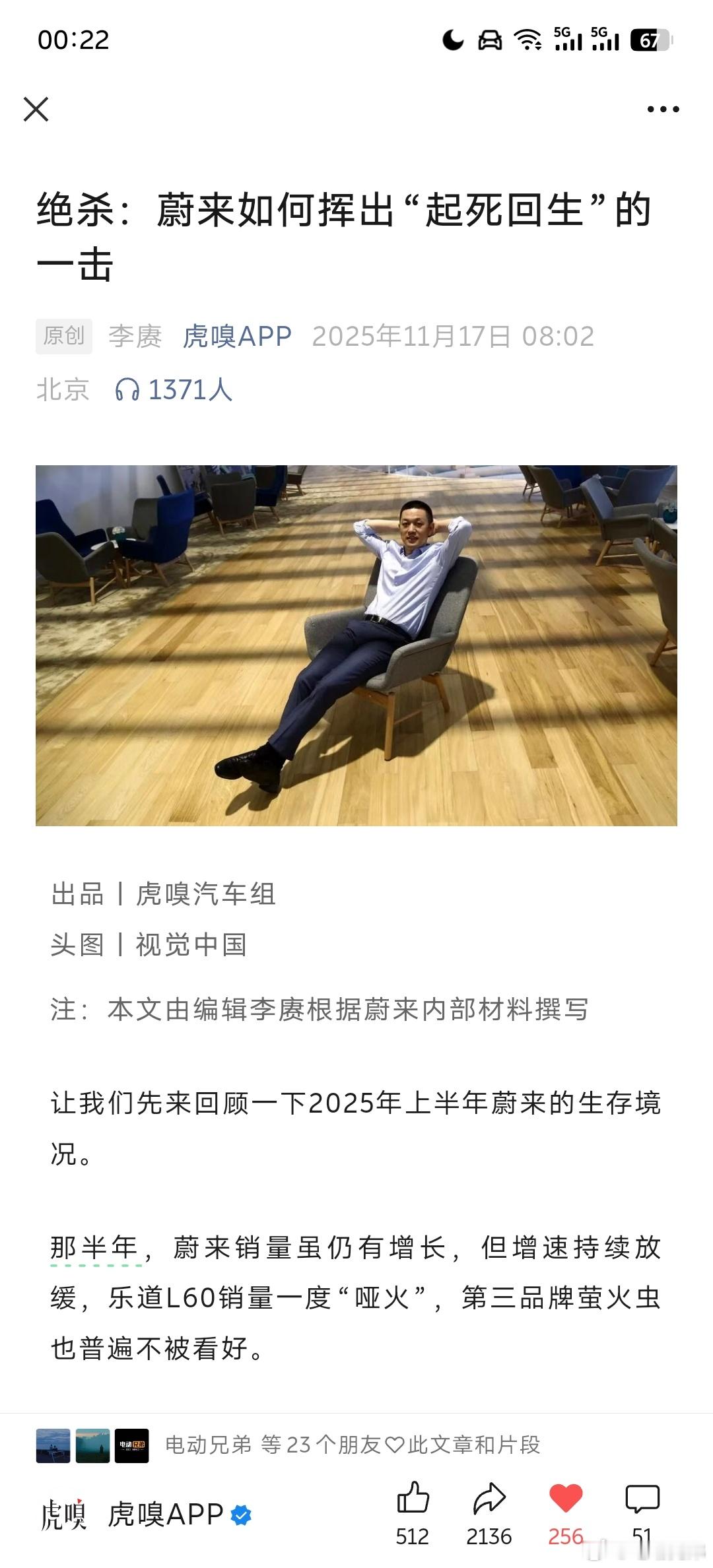 今天虎嗅的那篇文章我全部看完,看的很慢,边看边和我脑海里过去两三年自己体验到的相关节点在校对,感觉基本都对的上,还挺感慨。看完我就得出两个结论:第一,2024到2025上半年这轮真的很凶险,比2019年还要凶险。第二,蔚来已经走出了这轮凶险,这公司已经拥有了进入决赛圈的方法论,不仅抗击打能力强了,他已经具有了主动出击的能力。我最欣慰的是他们产品研发团队从一号位到二号位再到三号位终于可以 :重新洞察用户需求(斌哥愿意研究大尺寸登味设计)坚决体系化执行新的需求(天舒能够全面展开举一反三)坚决把想到的东西做出来且好用(孙宁天南海北的调用公司资源落地一切并怼在你面前)在我的理解中,这三位再➕智能端➕品牌端➕销售端,对产品的定义,销量,和最终市场化的成功承担全部责任。他们在定义第一颗螺丝时,就要想清楚这车卖给谁,什么价,能卖多少台。这是个一段式端到端的产品定义到销量的架构,这一架构似乎正在向世界模型演化,因为斌哥开始关注座椅调节按钮的布置等更多细节,他对产品世界的构建颗粒度开始变细,越细的产品感受世界模型越强大。过去多年李斌对宏观层面的押注准头极高,这点是公认的,当2023-2028版本李斌开始向产品微观层面掘进时,该版本CEO战力将大幅度增强。这个版本号是不是可以叫WL2328版,以往的CEO版本号为WL1722版如何通过这篇内容,大家可以看到其实网友们特别想教斌哥做CEO的一些建议在两三年前就已经开始部署落实,但迫于汽车公司严格的保密制度,这些具体的行动细节绝对不可以在当时就和大家沟通。大家想要大车,想要冰沙彩等最核心诉求在两三年就收到了并开始着手干活,想要解决的供应链问题斌哥也做了全部的努力包括和供应链连轴吃饭,但我也注意到还真有沟通后和平分手的。。。。。。真有内功才能真的幸运,蔚来为了走出困境哪怕在重压之下解决问题的方式依旧是真诚,科学,可持续的。而重压之下有的公司解决问题的方式一不小心就会变成情绪,不科学,乱跳变的。面对外部山呼海啸的质疑,内部用户和支持者大量建议,蔚来核心决策层没有出现意见涌入的挤兑,心态没有崩盘,而是用最大定力想要拿回根据地,调兵遣将持续梳理。终于在凶险的局面中拿出了第三代ES8,用40万以上单价瞬间收获大几万锁单,一下子稳住了局面。三代8这一波,稳前启后。后续的路挑战依然巨大,但我真的感觉蔚来已经长本事了,大心脏,大闭环,最终大收获。我不是一个天生大心脏的人,过去几年我难道一刻都没慌过吗,但我发现追踪蔚来这几年不论我是否愿意我的心脏也被慢慢练大了。回首每个练大时刻都挺后怕的,是类似于凝视深渊的感觉。此刻我正在想一个问题,到了2027年,该如何写当下正在发生的事呢