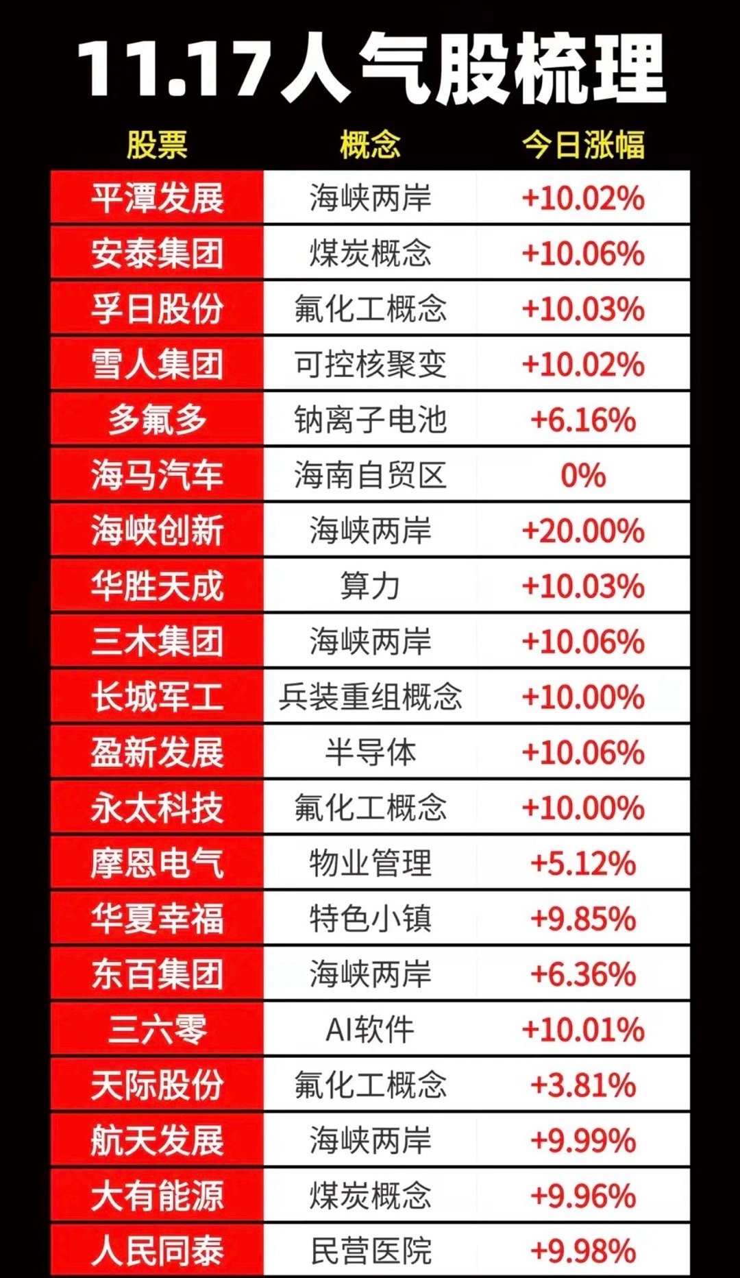 11.17周一收盘 成交活跃个股 人气榜!1.海峡两岸题材2.氟化工概念3.煤炭板块4.海南自贸港、