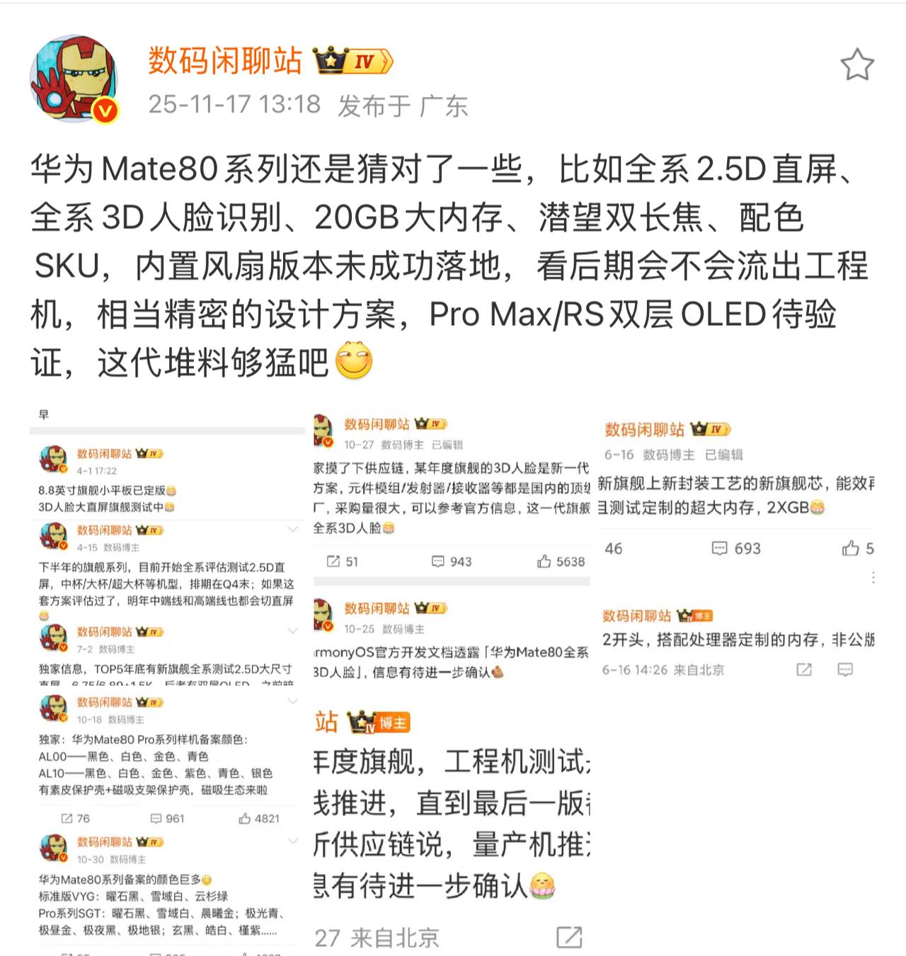 余承东彻底失算,Mate80还没发布,配置就被爆了个精光!回顾下准确配置,包括三个版本麒麟9030 1、Mate80标准版Kirin9020;Pro版12GB是9030,16GB版本9030 Pro;ProMax和RS版本为9030Pro;华为MateX7是Kirin9030ProMax。 2、全系直屏机+3D人脸解锁+侧边指纹;Mate80系除RS为陶瓷机身外,其他版本都为全一体成型金属机身。 3、影像方面,全系吃上RYYB,标准版和Pro为一个机模,三摄(单潜望长焦)+红枫二代;ProMax和RS为四摄(双潜望长焦)+红枫二代。后两者十档可变光圈,前两者待定。 4、Mate80ProMax全系16GB内存,RS全系20GB内存。 5、ProMax版本有eSIM无卡版本,其他包括RS好像没有。 6、麒麟9030ProMax满血版,架构的确为1+4+4,大核2.75GHz,不准确来捶我[狗头] 7、华为Mate80GTS风扇版本没落地,但的确开发了,后续可能会有工程机,搭载满血版麒麟9030 怎么说呢,不鸣则已一鸣惊人,华为时隔5年,麒麟芯片终于能在发布会讲了。并且从Mate70Air的芯片标注来看,Mate80系列的芯片应该是会印在包装盒上的[吃瓜群众],大家仔细想想,拿得出手的才要大大宣传,这次Mate80系列真凭“实力破圈”,所以改名与否无所谓,更好大众区分版本,并且产品力跟上了就行!华为Mate 80系列为何受关注
