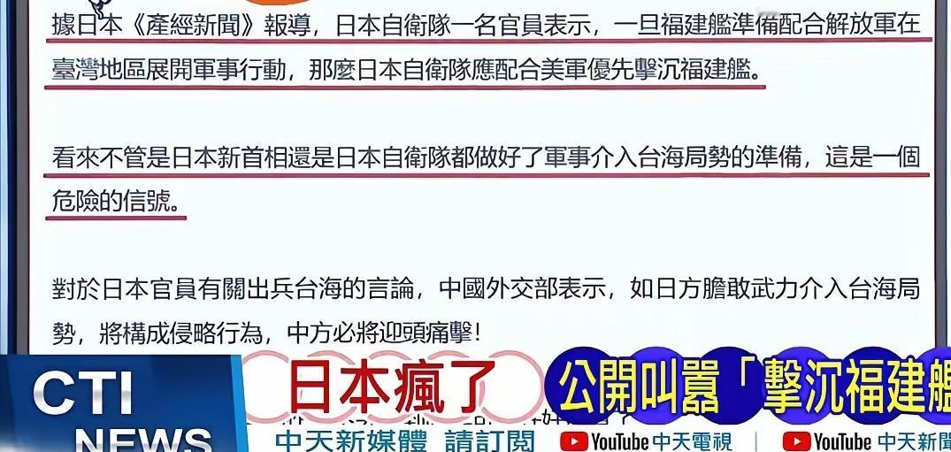 笑话来啦。日本产经新闻报道,日本自卫队一个官员表示,一旦开战,那么日本自卫队应配合美军优先击沉福建号航母。 咱们不说就因为日本四艘伪装成驱逐舰的现在可以起降F-35C的航母在福建舰前根本没有存活的机会,所以它才说要配合美军在开战时击沉又恨又怕又羡慕的福建舰这种话的,咱就说,日本凭什么说日本应配合美军,难道不是美军用枪逼着日本自卫队冲锋在前吗?主仆易主了?难不成在日本人眼里美军那么傻吗?日本连这种想法也能有,不是笑话吗?嗯,你日本奸,你日本贼,你日本有心眼儿。现在就想知道当美国知道日本把美国当傻子看时,会做出什么反应。