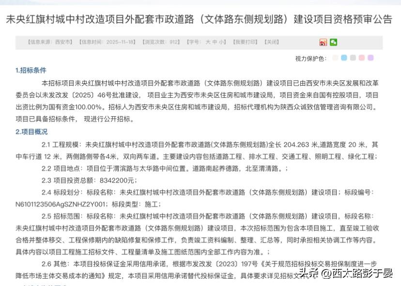 未央红旗村城中村改造项目外配套市政道路(文体路东侧规划路)建设项目资格预审公告 1.招标条件 本招标项目未央红旗村城中村改造项目外配套市政道路(文体路东侧规划路)建设项目已由西安市未央区发展和改革委员会以未发改发〔2025〕46号批准建设, 项目业主为西安市未央区住房和城市建设局,项目资金来自国有控股项目,项目出资比例为国有资金100.00%。招标人为西安市未央区住房和城市建设局,招标代理机构为陕西众诚致信管理咨询有限公司。项目已具备招标条件, 现进行公开招标。 2.项目概况 2.1 工程规模:未央红旗村城中村改造项目外配套市政道路(文体路东侧规划路)全长 204.263 米,道路宽度 20 米,其中车行道 12 米,两侧路侧带各4米,双向两车道。主要建设内容包括道路工程、排水工程、交通工程、照明工程、绿化工程; 2.2 项目地点:项目位于渭滨路与太华路中间位置。道路南起养德路,北至渭清路。; 2.3 项目投资总额:8342200元; 2.4 标段划分:标段名称:未央红旗村城中村改造项目外配套市政道路(文体路东侧规划路)建设项目;标段编号:N6101123506AgSZNHZ2Y001;标段类型:施工; 2.5 招标范围:标段名称:未央红旗村城中村改造项目外配套市政道路(文体路东侧规划路)建设项目,标段名称:未央红旗村城中村改造项目外配套市政道路(文体路东侧规划路)建设项目,本次招标范围为包含本项目施工,直至竣工验收合格并整体移交、工程保修期内的缺陷修复和保修工作,负责竣工资料编制、整理、汇总等,同时承担相关协调工作等内容。具体内容以项目工程施工招标文件、工程量清单及施工图纸范围内全部工作内容为准。; 2.6 其他:本项目投标保证金采用信用承诺,根据市发改发〔2023〕197号《关于规范招标投标交易担保制度进一步降低市场主体交易成本的通知》规定,本项目采用信用承诺替代投标保证金,具体要求详见招标文件。。