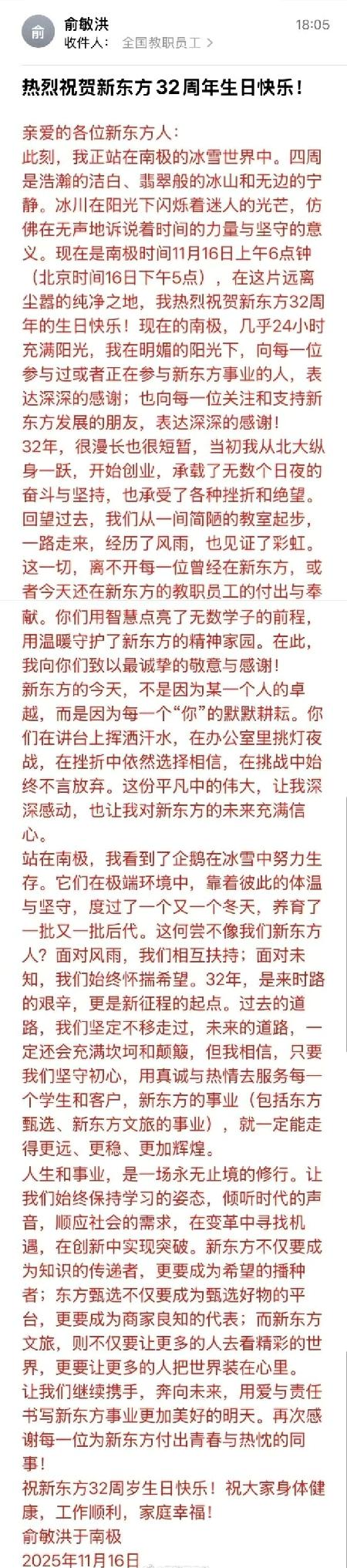 俞敏洪南极信翻车,员工吐槽刷屏!老板的诗和远方,打工人的加班现场? 这封信写于南极时间11月16日凌晨,俞敏洪用近千字描述冰川极光、企鹅团结,感谢员工“用汗水点亮学子前程”。 可国内员工正经历什么?有人刚上完10小时课挤晚高峰地铁,有人连夜赶工续费KPI,企业邮箱里那封标红信,被调侃成“虚无又狡黠的炫耀”。 矛盾爆发点在于“错位感”。信里5次提南极、17次用“我”,却对加班压力只字未提。 员工回怼:“您在南极看冰山,我在出租屋看数据!” 更扎心的是,新东方刚交出一份利润暴跌73.7%的财报,转型压力全压在一线,这时候谈“诗意坚守”,难免让员工觉得讽刺。 其实职场人反感的从来不是老板度假,而是共情缺失。 有内部员工私下说:“本意或许不坏,但大家在加班,你晒极光聊企鹅,这碗鸡汤实在喝不下。” 比起“南极哲学”,员工更想看到加班费、任务减负,或者至少一句“辛苦大家,压力我懂”。 这事说穿了,现代职场早就不吃“单向感动”那套。老板的诗和远方,若离员工的油盐太远,再美的词句也会摔回地上。 真正的好公司,不是让员工仰望南极的老板,而是让老板看得见办公桌前的灯。