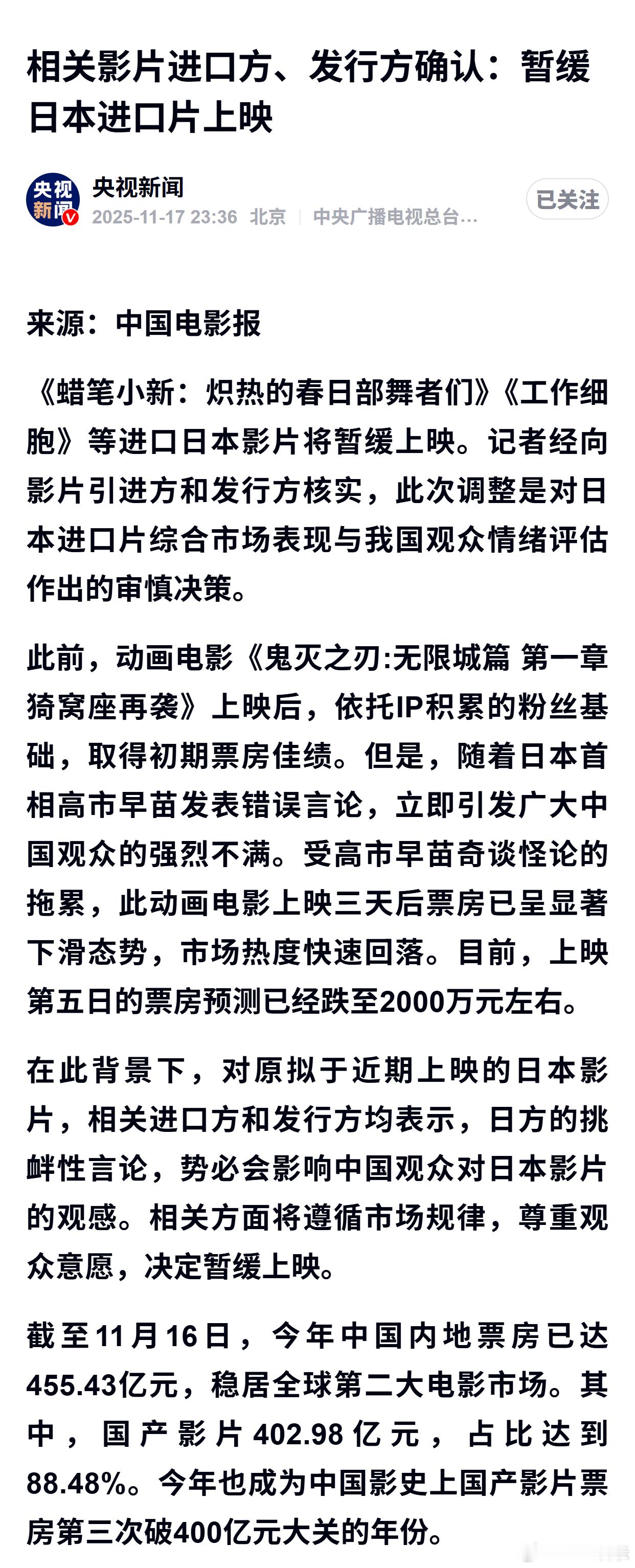 相关影片进口方、发行方确认:暂缓日本进口片上映