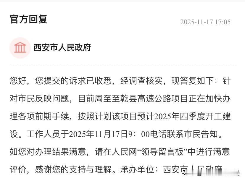 关于G9908西安都市圈周至至乾县高速。 2025年年初政府报告和交通部门也提出2025年四季度开工,目前还未见动静,请问领导什么时候可以开工? 官方回复 2025-11-17 17:05 西安市人民政府 您好,您提交的诉求已收悉,经调查核实,现答复如下:针对市民反映问题,目前周至至乾县高速公路项目正在加快办理各项前期手续,按照计划该项目预计2025年四季度开工建设。