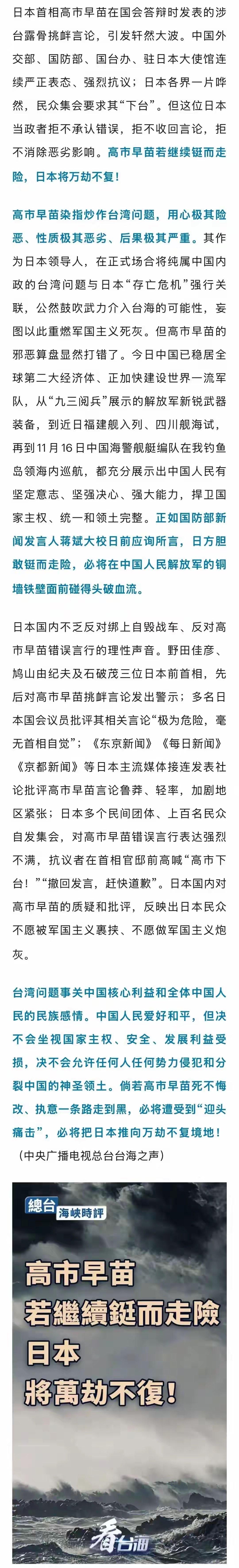高市早苗“死不悔改”,看来是要一条道走到黑了,日本的态度是明显不打算“悔过道歉”了。我们要迎头痛击,这是是我们的态度。万劫不复境地就是日本的结局,日本要好自为之! 日本现在是狐狸的尾巴彻底的露出来。日本公开成为了我们统一台湾大业中除美国之外的又一大的阻碍势力,甚至要比美国在阻碍我们的统一大业的还要跳的凶,所以这次一定要彻底打击日本的嚣张气焰! 高市早苗如果继续铤而走险,日本将万劫不复,感觉这句话要比“悬崖勒马”严重的多,由总台播出来,其对日本的警告程度可见之力度! 高市的涉台言论恶劣至极,让总台都用上了“死不悔改”、“迎头痛击”、“万劫不复”,可见高市早苗的言论之恶劣!