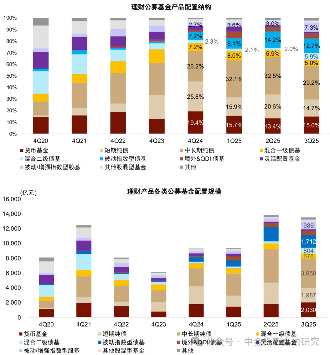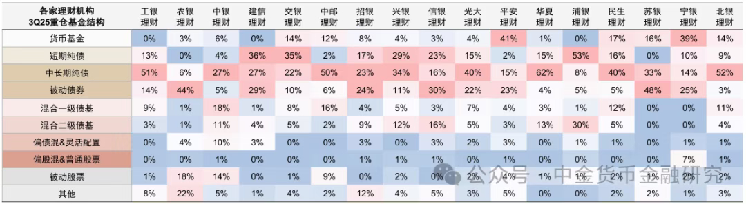 谁躺谁卷一目了然,体制决定策略。17家理财子各家的策略都不太一样,宁波银行是躺平策略,平安银行跟宁波银行有点像,这种策略直接搞40%的货币+25%的债券指数,虽然不能算彻底躺平,至少是侧卧在打盹吧。招行还是老一套核心+卫星策略。其他银行基本随大流,农银换了一个新领导,也开始卷业绩了,直接把短债仓位清掉了,增加了18%的被动权益,搞了22%QDII和黄金。工银内部做得好也不会有啥好处,做的不好就都是问题,干脆大家干啥我干啥,主要工作不是我要干啥,而是看看别人在干啥,然后抄一下就行。只要不被罚,就万事大吉了。银行理财子跟公募基金一样,某种程度上看,也是被动配置,他对市场的影响会有一点,但不是决定性的。市场最终的走向还是取决于居民的投资偏好,而居民的投资偏好一方面是跟监管引导有关,另一方面跟宏观的经济环境有关。从这个角度看,其实市场还是有可能继续往上涨的。