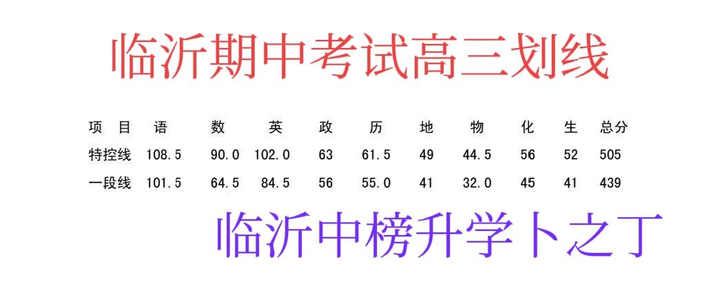 临沂高中期中考试划线:特招线为505分,本科线为439分。家有高三考生的家长,可以拿这个线对照一下,文科本科线上40分,也就是479分,大概率能有本科读,理科会稍微好一点。欢迎大家留言文明交流!