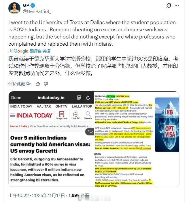 就读于德克萨斯大学分校的学生吐槽,学生中超过80%是印度裔。考试和作业作弊现象十分猖獗,但学校除了解雇那些抱怨的白人教授,并用印度裔教授取而代之之外,什么也没做。