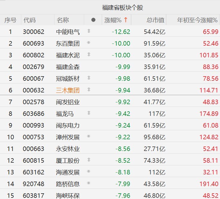 【 ,三木集团等多股跌停】 11月18日,A股市场福建板块全线下挫,其中,中能电气跌超12%,东百集团、福建水泥、福建金森、冠城新材、三木集团10CM跌停,闽发铝业、福龙马、闽东电力、漳州发展逼近跌停,永安林业、厦工股份、海通发展跌超8%,路桥信息、海峡环保跌超7%。消息面上,此前持续上涨的海峡创新和平潭发展昨晚双双发布公告宣布,股票交易价格严重背离公司基本面,今日起停牌核查。