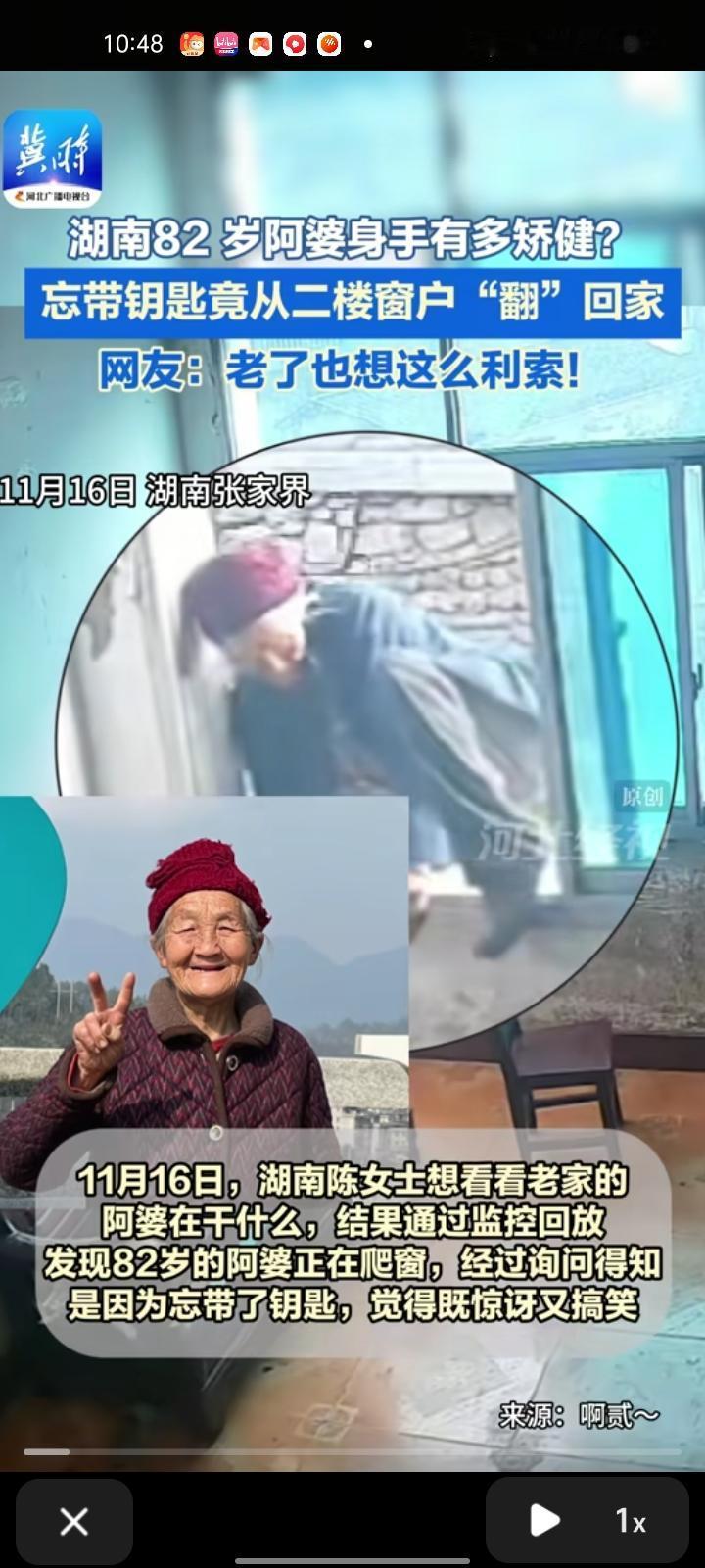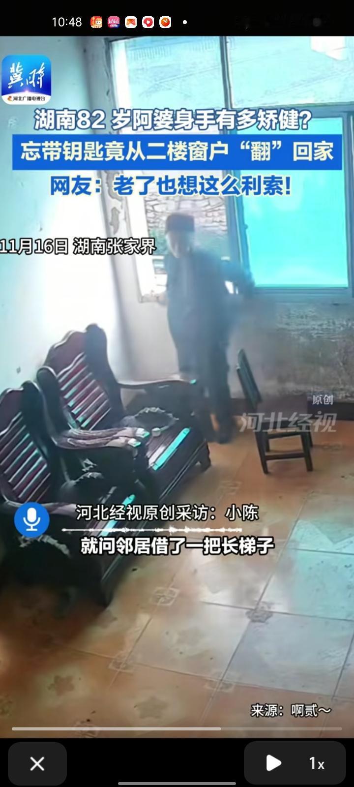 11月16日,湖南张家界。陈女士想看看老家的阿婆在干什么,看了监控回放,发现阿婆正在爬窗。经询问得知,阿婆是因为忘带钥匙,去邻居家借长梯子,从二楼窗户翻过去,下面有人扶着椅子,觉得惊讶又搞笑。