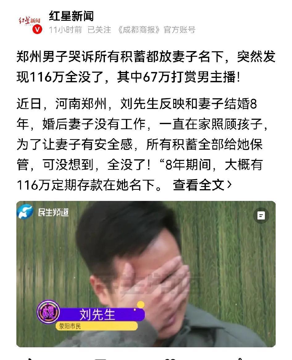 116万积蓄,其中67万被打赏给男主播了,余下的不知道被用哪去了,还欠了8万的钱。容我评价一句:娶了这样的妻子,真是倒了八辈子霉了! 家庭的钱,放在谁手上都不安全,男人会给女主播打赏,女人会给男主播打赏,男人会赌博,女人会美容,谁都有可能把家里的钱败坏。 最安全的方式,就是夫妻各人存个人的钱,月底汇总家庭开销,所有的支出对半分,虽然有点AA制的感觉,但是能保证钱的安全。