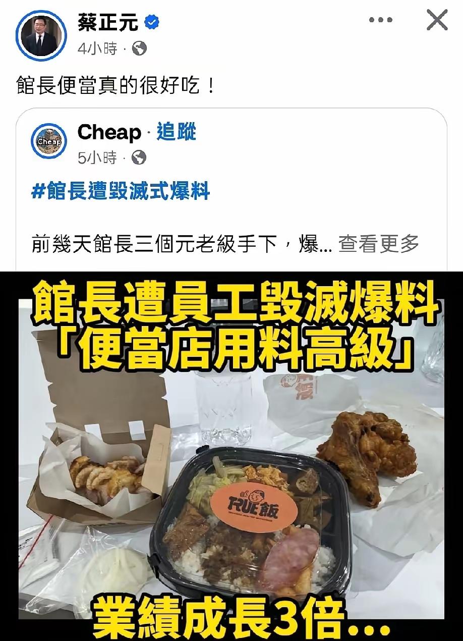 台湾网红馆长被自己的徒弟背刺成了台湾的热门新闻,不过听来听去这些徒弟们的爆料却反面论证了馆长的便当店是良心餐厅,不但用料干净卫生,而且对员工也是诚心诚意。连蔡正元也去吃了点赞。 不过可能也是发现自己的爆料对于馆长没什么用,这个大徒弟现在开始跪地求饶,向馆长喊话说自己是在演戏,是为了便当店的生意搞的苦肉计。 问题是馆长能原谅这个反骨仔吗?